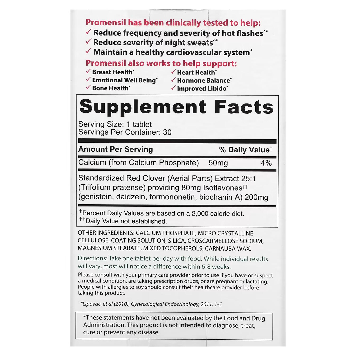 Не является лекарственным средством. Безопасный и натуральный способ избавиться от симптомов менопаузы. Поддерживает здоровье сердечно-сосудистой системы. Кроме того, Promensil поддерживает. Здоровье молочных желез.