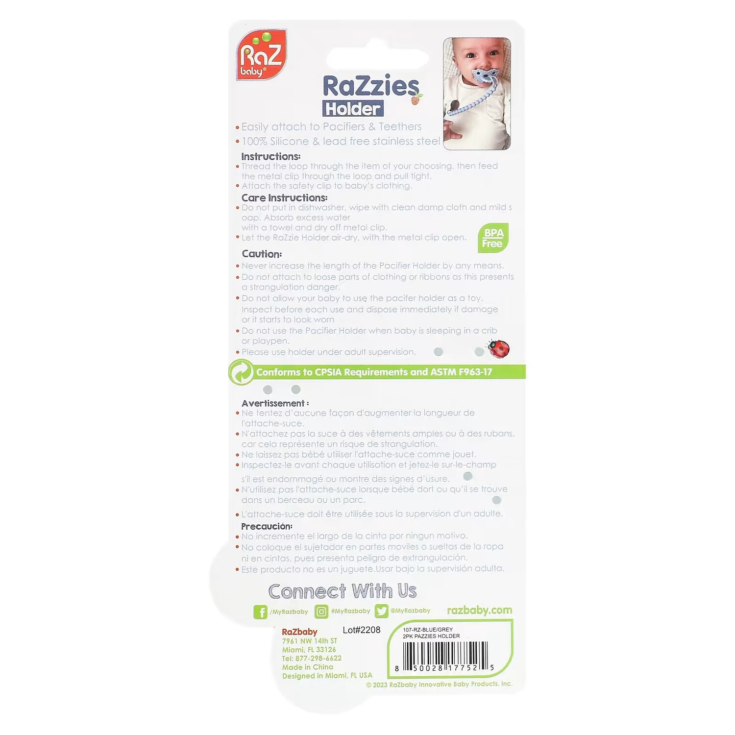 Ни в коем случае не увеличивайте длину держателя для пустышки. Не прикрепляйте к свободным частям одежды или лентам, поскольку это может привести к удушению. Не позволяйте ребенку использовать подставку для пустышки в качестве игрушки. Осматривайте продукт перед каждым использованием и немедленно утилизируйте продукт, если он поврежден или выглядит изношенным. Не используйте держатель для пустышки, когда ребенок спит в детской кроватке или манеже.