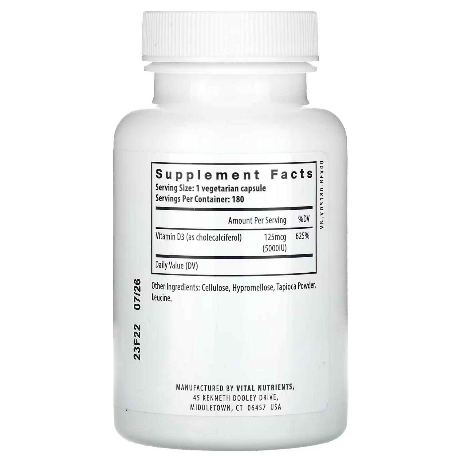 Витамин D3 Vital Nutrients 5000 МЕ, 180 вегетарианских капсул