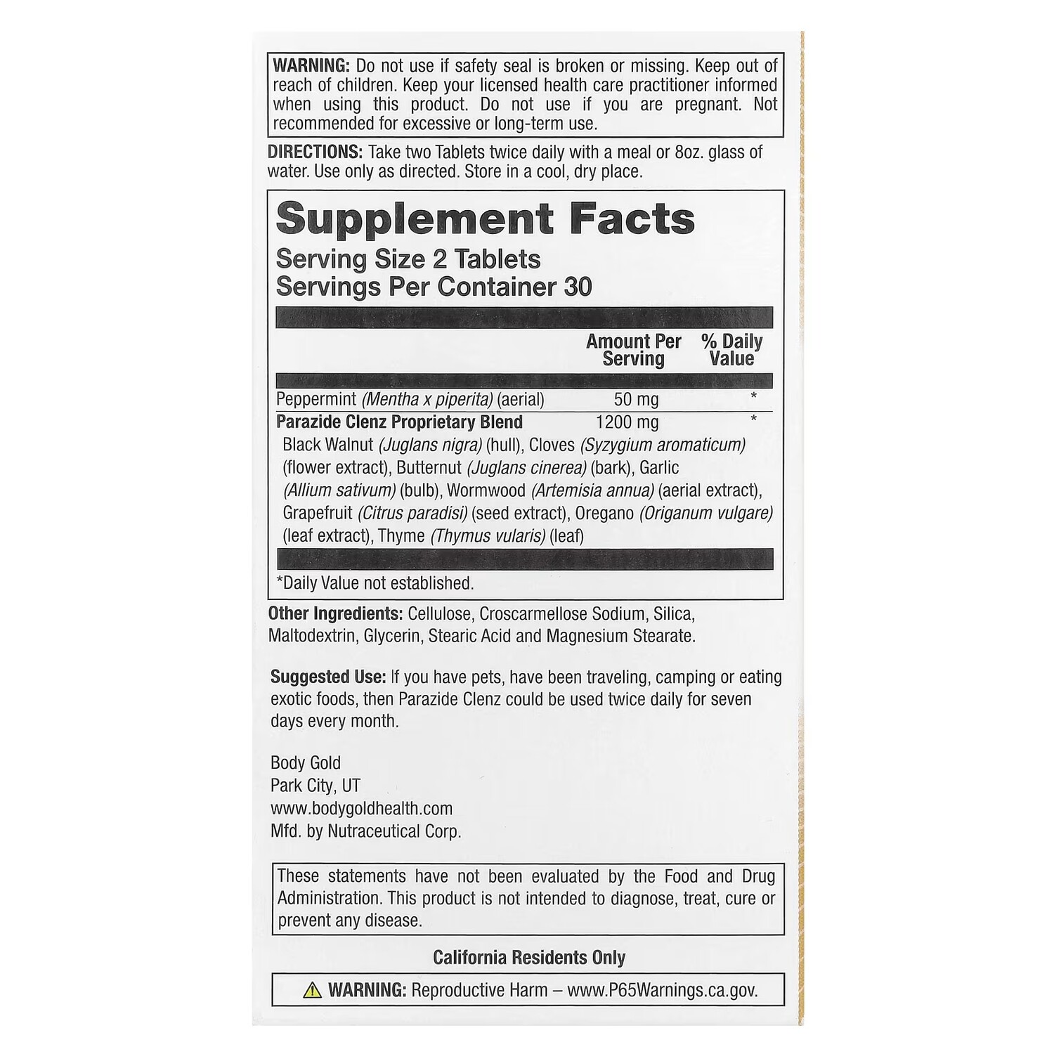 Комплексная смесь BodyGold Parazide Clenz для кишечника, 60 таблеток