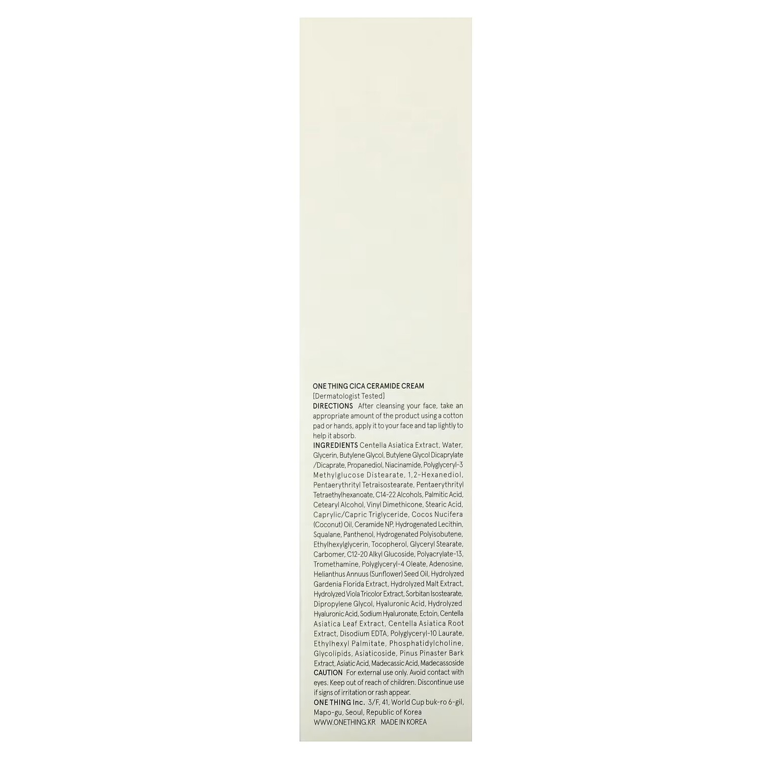 Состав: экстракт готу колы (Centella asiatica), вода, глицерин, бутиленгликоль, бутиленгликоль дикаприлат/дикапрат, пропандиол, никотинамид, полиглицерил-3 метилглюкозы дистеарат, 1,2-гександиол, пентаэритритил тетраизостеарат, пентаэритритил тетраэтилгексаноат, спирты C14-22, пальмитиновая кислота, цетеариловый спирт, винилдиметикон, стеариновая кислота, каприловый/каприновый триглицерид, кокосовое масло (Cocos nucifera), керамид NP, гидрогенизированный лецитин, сквалан, пантенол, гидрогенизированный полиизобутен, этилгексилглицерин, токоферол, глицерил стеарат, карбомер, С12-20 алкил глюкозид, полиакрилат-13, трометамин, полиглицерил-4-олеат, аденозин, подсолнечное масло (Helianthus annuus), гидролизованный экстракт гардении жасминовидной (Gardenia florida), гидролизованный солодовый экстракт, гидрозигидролизованный экстракт фиалки трехцветной (Viola tricolor), сорбитан изостеарат, дипропиленгликоль, гиалуроновая кислота, гидролизованная гиалуроновая кислота, гиалуронат натрия, эктоин, экстракт листьев готу колы (Centella asiatica), экстракт корня готу колы (Centella asiatica), двунатриевая ЭДТК, полиглицерил-10 лаурат, этилгексил пальмитат, фосфатидилхолин, гликолипидов, азиатикозид, экстракт коры сосны приморской (Pinus pinaster), азиатиковая кислота, мадекассовая кислота, мадекассосид.