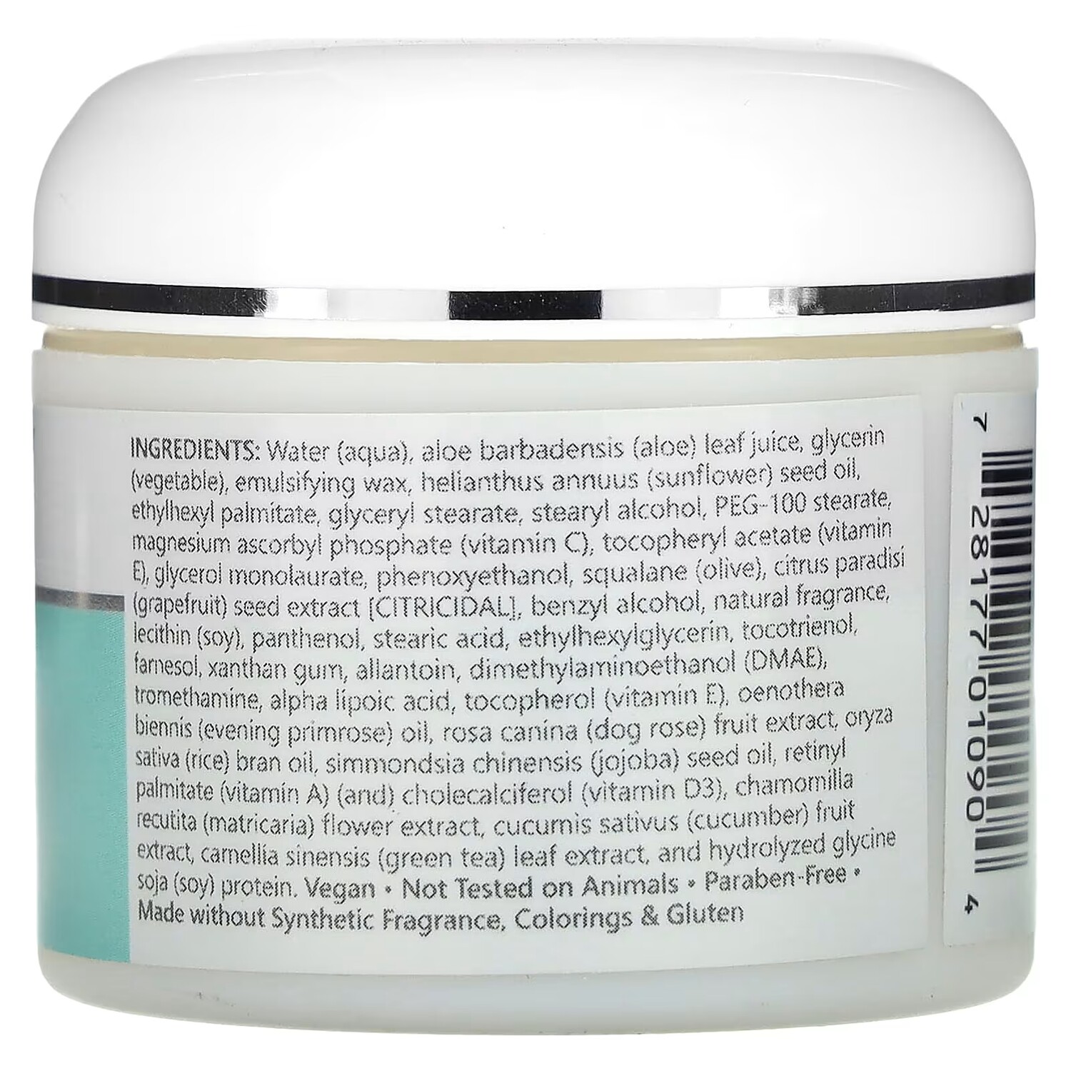 Состав: вода, сок листьев алоэ вера (Aloe barbadensis), глицерин (растительный), воск эмульгированный, подсолнечное масло (Helianthus annuus), этилгексил пальмитат, глицерил стеарат, стеариловый спирт, ПЭГ-100 стеарат, аскорбилфосфат магния (витамин C), токоферилацетат (витамин Е), глицерол монолаурат, феноксиэтанол, сквалан (из оливкового масла), экстракт косточек грейпфрута (Citrus paradisi) [Citricidal], бензиловый спирт, натуральная отдушка, лецитин (из сои), пантенол, стеариновая кислота, этилгексилглицерин, токотриенол, фарнезол, ксантановая камедь, аллантоин, диметиламиноэтанол (ДМАЭ), трометамин, альфа-липоевая кислота.