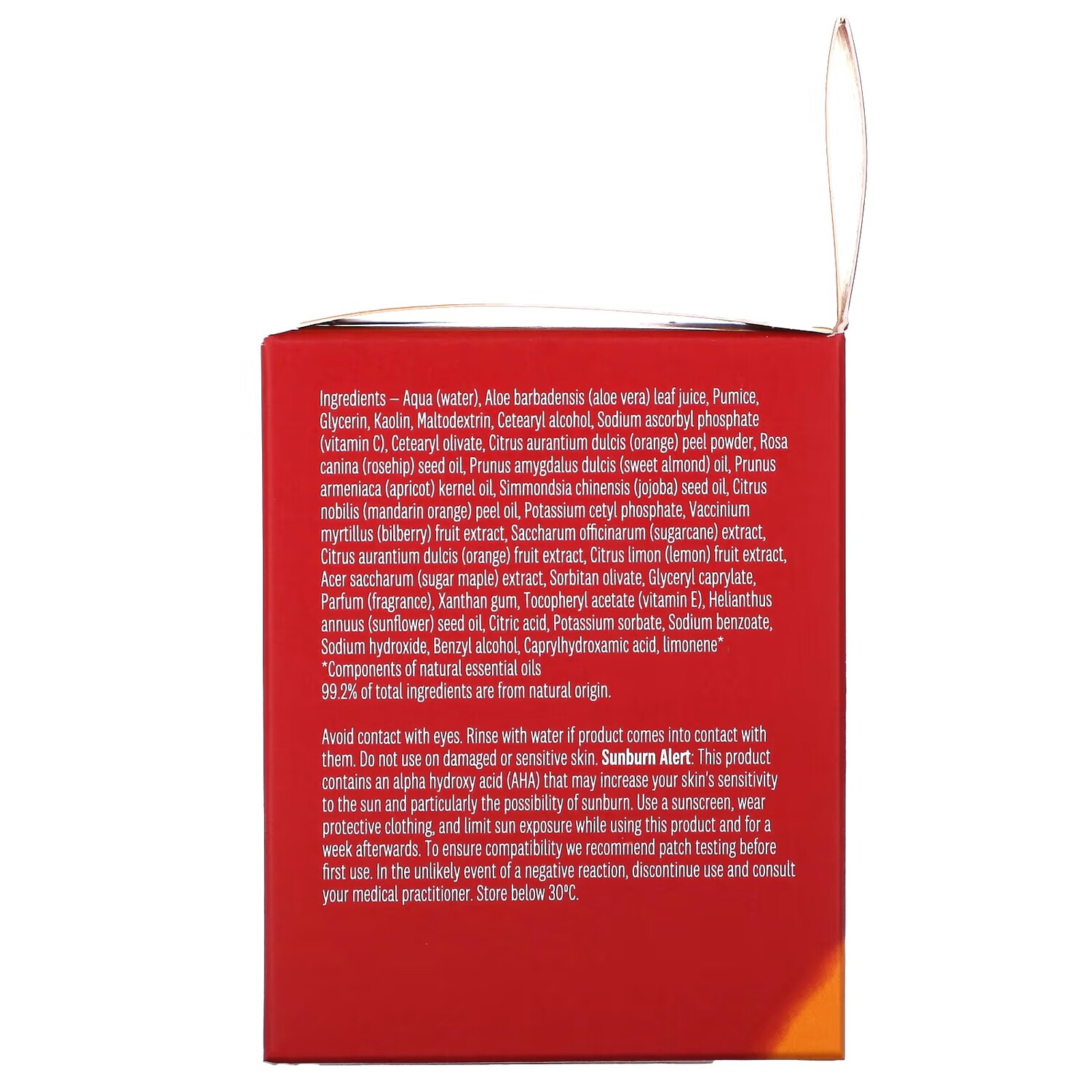 Состав: вода, сок листьев алоэ вера (Aloe barbadensis), пемза, глицерин, каолин, мальтодекстрин, цетеариловый спирт, аскорбил фосфат натрия (витамин C), цетеарил оливат, порошок из цедры апельсина (Citrus aurantium dulcis), масло из семян шиповника (Rosa canina), масло сладкого миндаля (Prunus amygdalus dulcis), масло из косточек абрикоса (Prunus armeniaca), масло из семян жожоба (Simmondsia chinensis), масло из цедры мандарина (Citrus nobilis), цетилфосфат калия, экстракт плодов голубики (Vaccinium myrtillus), экстракт сахарного тростника (Saccharum officinarum), экстракт плодов апельсина (citrus aurantium dulcis), экстракт плодов лимона (citrus limon), экстракт сахарного клена (Acer saccharum), сорбитан оливат, глицерил каприлат, парфюмерная композиция (отдушка), ксантановая камедь, токоферилацетат (витамин Е), подсолнечное масло (Helianthus annuus), лимонная кислота, сорбат калия, бензоат натрия, гидроксид натрия, бензиловый спирт, каприлгидроксаминовая кислота, лимонен.