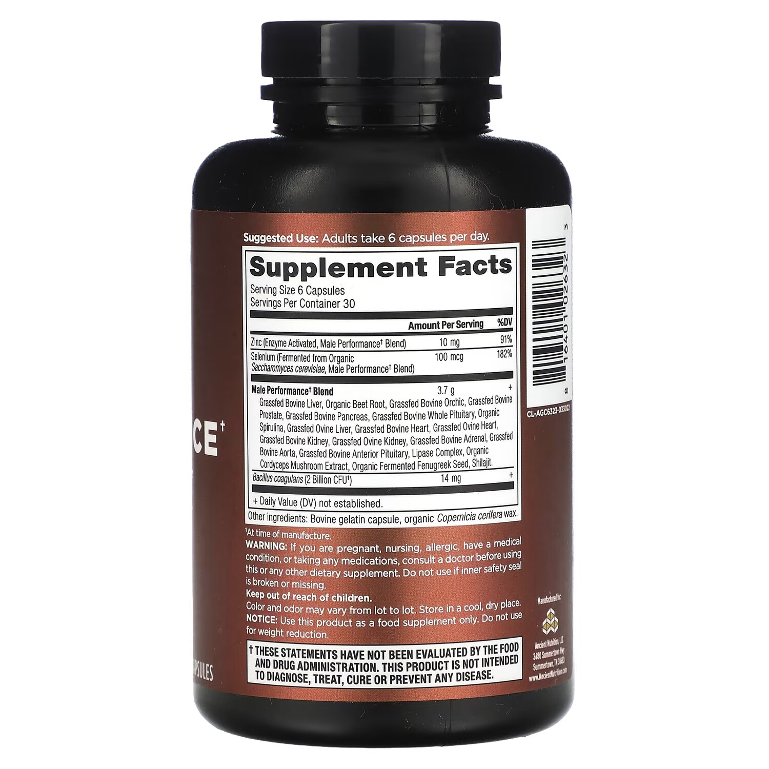 Пищевая ценностьРазмер порции: 6 капсулПорций в упаковке: 30 Количество в 1 порции% от суточной нормыЦинк (активированный ферментами смесь для мужчин)10 мг91%Селен (ферментированный из органических сахаров сахаромицетов, смесь для самцов)100 мкг182%Смесь для мужчинПечень крупного рогатого скота, органическая свекла, корень травяного крупного рогатого скота, простата крупного рогатого скота, поджелудочная железа крупного рогатого скота, цельный гипофиз крупного рогатого скота, органическая спирулина, печень травяной овцы, сердце из бычьей коровы, сердцевина ячменя из злаков Надпочечники, аорта крупного рогатого скота, передняя доля гипофиза крупного рогатого скота, комплекс липазы, экстракт органического гриба кордицепс, семена органического ферментированного пажитника, мумие.3,7 г+Bacillus coagulans (2 млрд КОЕ¹)14 мг++ Суточная норма не определена.¹ На момент производства.