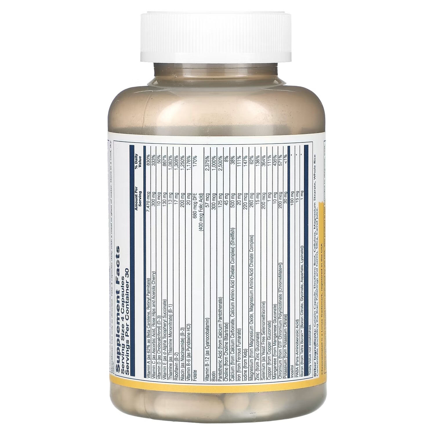 Пищевая ценностьРазмер порции: 4 капсулыПорций в упаковке: 30 Количество в 1 порции% от суточной нормыВитамин A (62% в виде бета-каротина, ретинилпальмитата)7 470 мкг830%Витамин С (в виде аскорбиновой кислоты, шиповника и ацеролы)300 мг333%Витамин D (в виде холекальциферола, витамина D3)10 мкг50%Витамин E (в виде d-альфа-токоферил сукцината)130 мг867%Тиамин (в виде тиамина мононитрата, витамина B1)13 мг1083%Рибофлавин (витамин B2)17 мг1308%Ниацин (в виде никотинамида, витамина В3)200 мг1250%Витамин B6 (в виде пиридоксина гидрохлорида)20 мг1176%Фолат680 мкг пищевого фолатного эквивалента (400 мкг фолиевой кислоты)170%Витамин B12 (в виде цианокобаламина)57 мкг2375%Биотин300 мкг1000%Пантотеновая кислота (из пантотената кальция)125 мг2500%Холин (из битартрата холина)45 мг8%Кальций (из карбоната кальция, аминокислотного хелатного комплекса кальция) (из моллюсков)500 мг38%Железо (из фумарата железа)20 мг111%Йод (из бурых водорослей)220 мкг147%Магний (из оксида магния, аминокислотного хелатного комплекса магния)260 мг62%Цинк (из глюконата цинка)15 мг136%Селен (в виде бездрожжевого селенометионина)200 мкг364%Медь (из глюконата меди)1 мг111%Марганец (из глюконата марганца)10 мг435%Хром (из полиникотината хрома GTF [ChromeMate)200 мкг571%Калий (из цитрата калия)30 мг<1%Инозитол100 мг*Парааминобензойная кислота (ПАБК)15 мг*Бор (из Tetra Boron [цитрат бора, глицинат, аспартат, лизинат])1 мг** Суточная норма не определена.