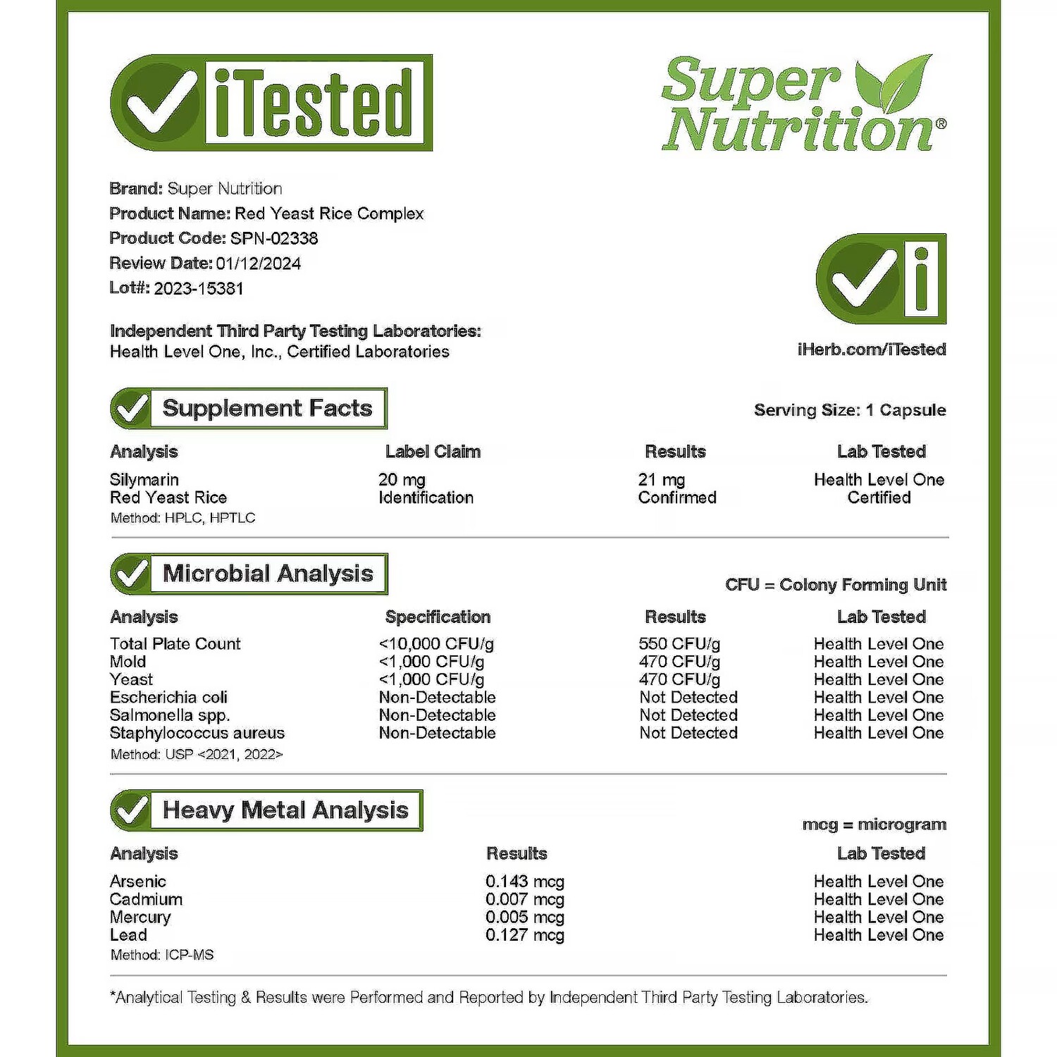 Пищевая ценностьРазмер порции: 1 капсулаПорций в упаковке: 120 Количество в 1 порции% от суточной нормыОрганический красный ферментированный рис (Monascus purpureus)600 мг†N-ацетилцистеин50 мг † Коэнзим Q10 (в виде убихинона)30 мг † Экстракт семян расторопши (Silybum marianum), стандартизированный до содержания 80% силимарина (20 мг)25 мг† † Суточная норма не определена.