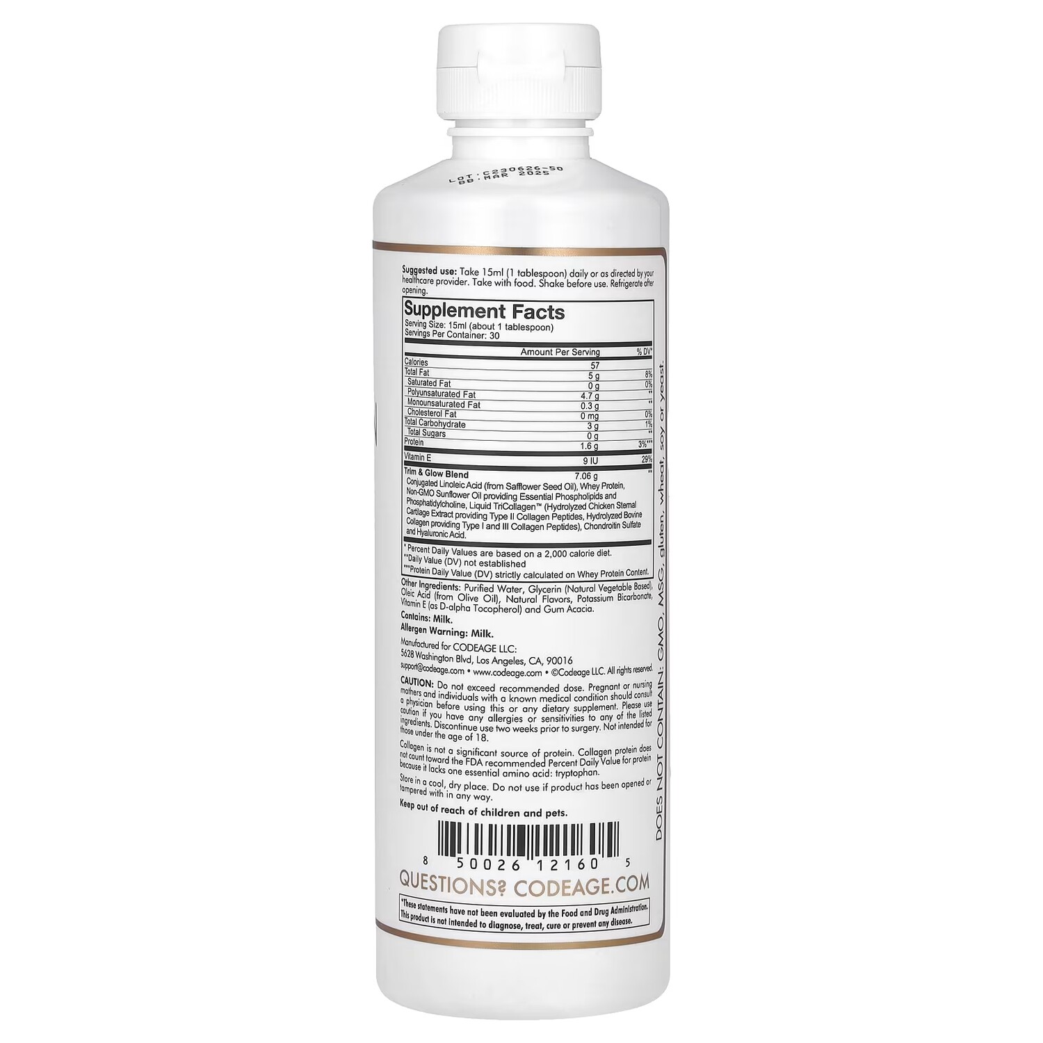 Пищевая ценностьРазмер порции: 15 мл (примерно 1 столовая ложка)Порций в упаковке: 30 Количество в 1 порции% от суточной нормы*Калории 57 Всего жиров 5 г 8%Насыщенные жиры 0 г 0%Полиненасыщенные жиры 4,7 г **Мононенасыщенные жиры 0,3 г **Холестериновые жиры 0 мг 0%Всего углеводов 3 г 1%Всего сахара 0 г **Белок 1,6 г 3%***Витамин E 9 МЕ 29%Смесь Trim & GlowКонъюгированная линолевая кислота (из масла семян сафлора), сывороточный протеин, подсолнечное масло без ГМО, содержащее незаменимые фосфолипиды и фосфатидилхолин, жидкий TriCollagen (гидролизованный экстракт куриного грудного хряща, содержащий пептиды коллагена типа II, гидролизованный бычий коллаген, обеспечивающий пептиды коллагена типа I и III) , Хондроитинсульфат и гиалуроновая кислота.7,06 г *** Процент от суточной нормы при условии потребления 2000 калорий в день.** Суточная норма не определена.** Суточная норма протеина строго рассчитана на основе содержания сывороточного протеина.