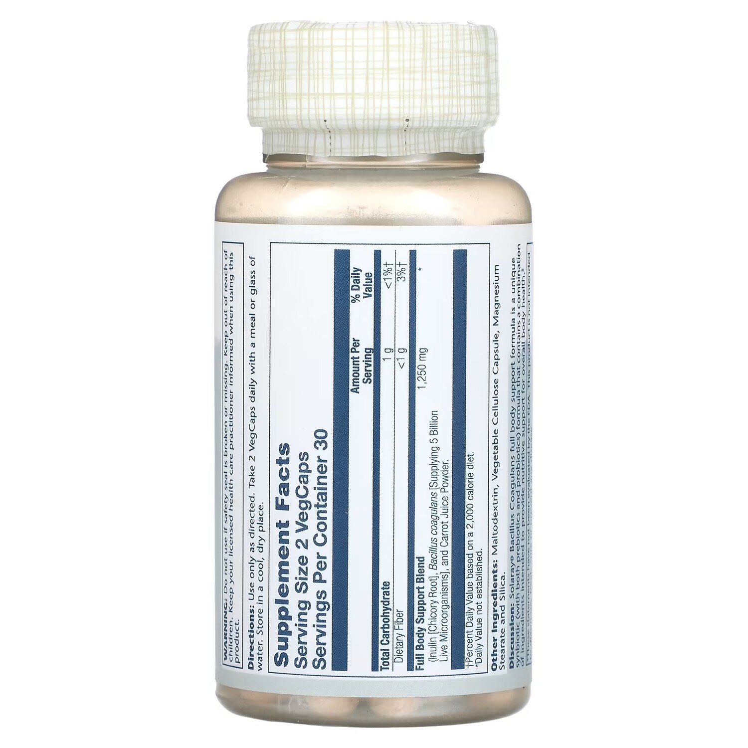 Пищевая ценностьРазмер порции: 2 вегетарианские капсулыПорций в упаковке: 30 Количество в 1 порции% от суточной нормыВсего углеводов 1 г <1%†Пищевая клетчатка <1 г 4%†Смесь для полной поддержки тела (Инулин [корень цикория], бактерии бациллус коагуланс (B. coagulans) [источник 5 млрд живых микроорганизмов**] и порошок из морковного сока.1250 мг*† Процент от суточной нормы при условии потребления 2000 калорий в день.* Суточная норма не определена.