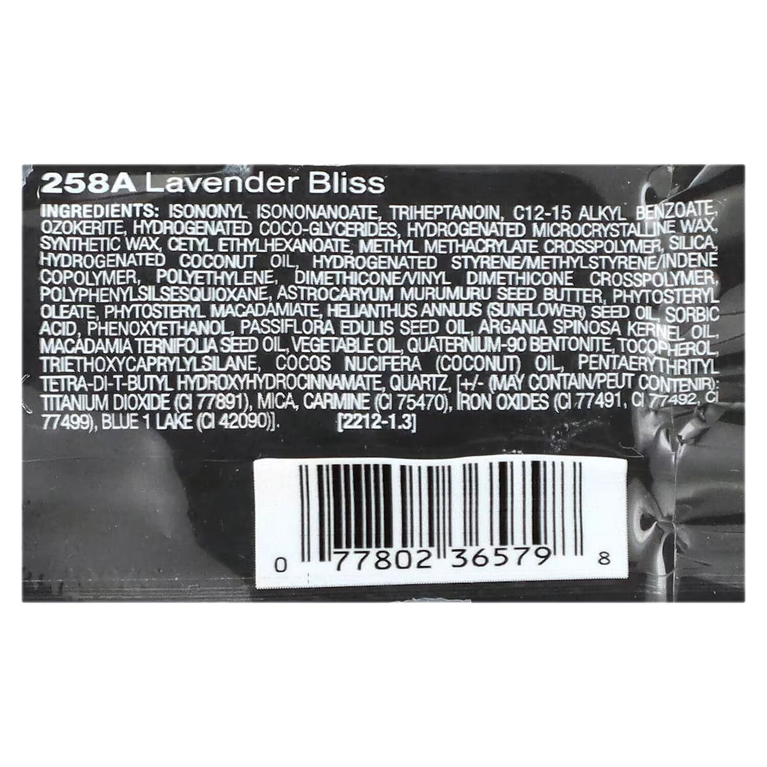 Изононил изононаноат, тригептаноин, c12-15 алкил бензоат, озокерит, гидрогенизированные кокоглицериды, гидрогенизированный микрокристаллический воск, синтетический воск, цетилэтилгексаноат, метил метакрилат кроссполимер, диоксид кремния, гидрогенизированное кокосовое масло, гидрогенизированный сополимер стирола/метилстирола/индена, полиэтилен, диметикон/винил диметикон кроссполимер, полифенилсилсесквиоксан, масло семян мурумуру (Astrocaryum murumuru), фитостерил олеат, фитостерил макадамиат, подсолнечное масло (Helianthus annuus), сорбиновая кислота, феноксиэтанол, масло из семян маракуйи (Passiflora edulis), аргановое масло (Argania spinosa), масло макадамии (Macadamia ternifolia), растительное масло, кватерниум-90 бентонит, токоферол, триэтоксикаприлилсилан, кокосовое масло (Cocos nucifera), пентаэритритил тетра-ди-трет-бутил гидроксигидроциннамат, кварц, [может содержать диоксид титана (CI 77891), слюда, кармин (CI 75470), оксиды железа (CI 77491, CI 77492, CI 77499), краситель синий 1 лак (CI 42090)].