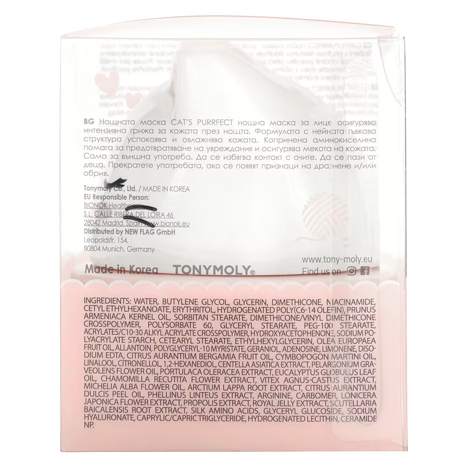 Вода, бутиленгликоль, глицерин, диметикон, никотинамид, цетилэтилгексаноат, эритритол, гидрогенизированный поли (C6-14 олефин), чернослив масло из косточек армянской, сорбитан стеарат, диметикон/винил диметикон кроссполимер, полисорбат 60, глицерил стеарат, ПЭГ-100 стеарат, акрилат/c10-30 алкил акрилат кроссполимер, гидроксиацетофенон, полиакрилат натрия крахмал, цетеарил стеарат, этилгексилглицерин, масло из плодов оливы европейского (Olea europaea), аллантоин, полиглицерил-10 миристат, гераниол, аденозин, лимонен, двунатриевая ЭДТК, масло из плодов бергамота (Citrus aurantium bergamia), масло пальмарозы (Cymbopogon martini), линалоол, цитронеллол, 1,2-гександиол, экстракт готу колы (Centella asiatica), масло из цветков герани (Pelargonium graveolens), экстракт портулака огородного (Portulaca oleracea), масло из листьев эвкалипта шаровидного (Eucalyptus globulus), экстракт цветков ромашки (Chamomilla recutita), экстракт витекса (Vitex agnus-castus), масло из цветков Michelia alba, экстракт корня лопуха (Arctium lappa), масло из цедры апельсина сладкого (Citrus aurantium dulcis), экстракт санхвана (Phellinus linteus), аргинин, карбомер, экстракт цветков жимолости японской (Lonicera japonica), экстракт прополиса, экстракт маточного молочка, экстракт корня шлемника (Scutellaria baicalensis), аминокислоты шелка, глицерил глюкозид, гиалуронат натрия, каприловый/каприновый триглицерид, гидрогенизированный лецитин, керамид NP.