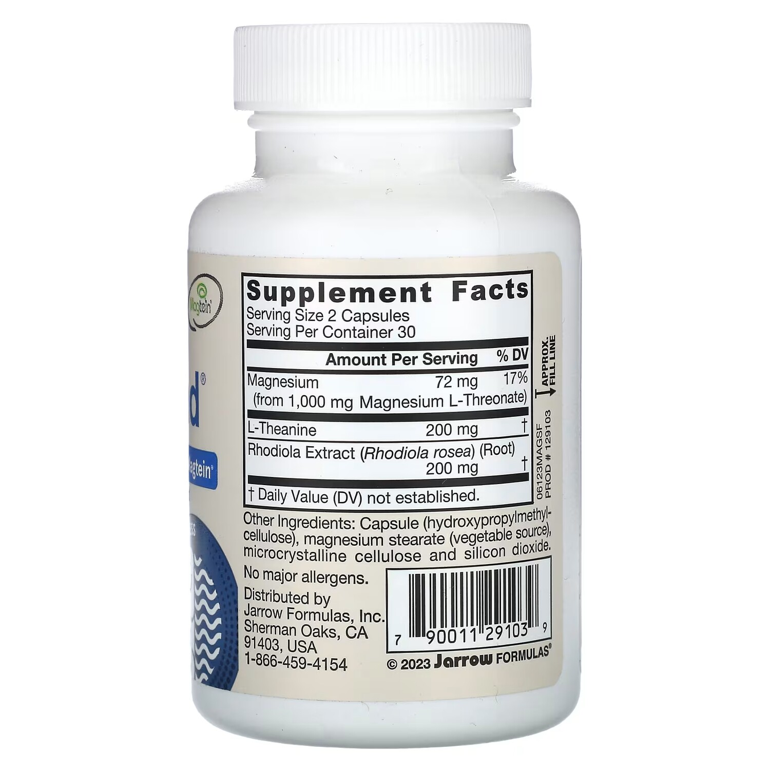 Пищевая ценностьРазмер порции: 2 капсулыПорций в упаковке: 30 Количество в 1 порции% от суточной нормыМагний (из 1000 мг L-треоната магния)72 мг17%L-теанин 200 мг†Экстракт родиолы розовой (Rhodiola rosea) (корень)200 мㆆ Суточная норма не определена.