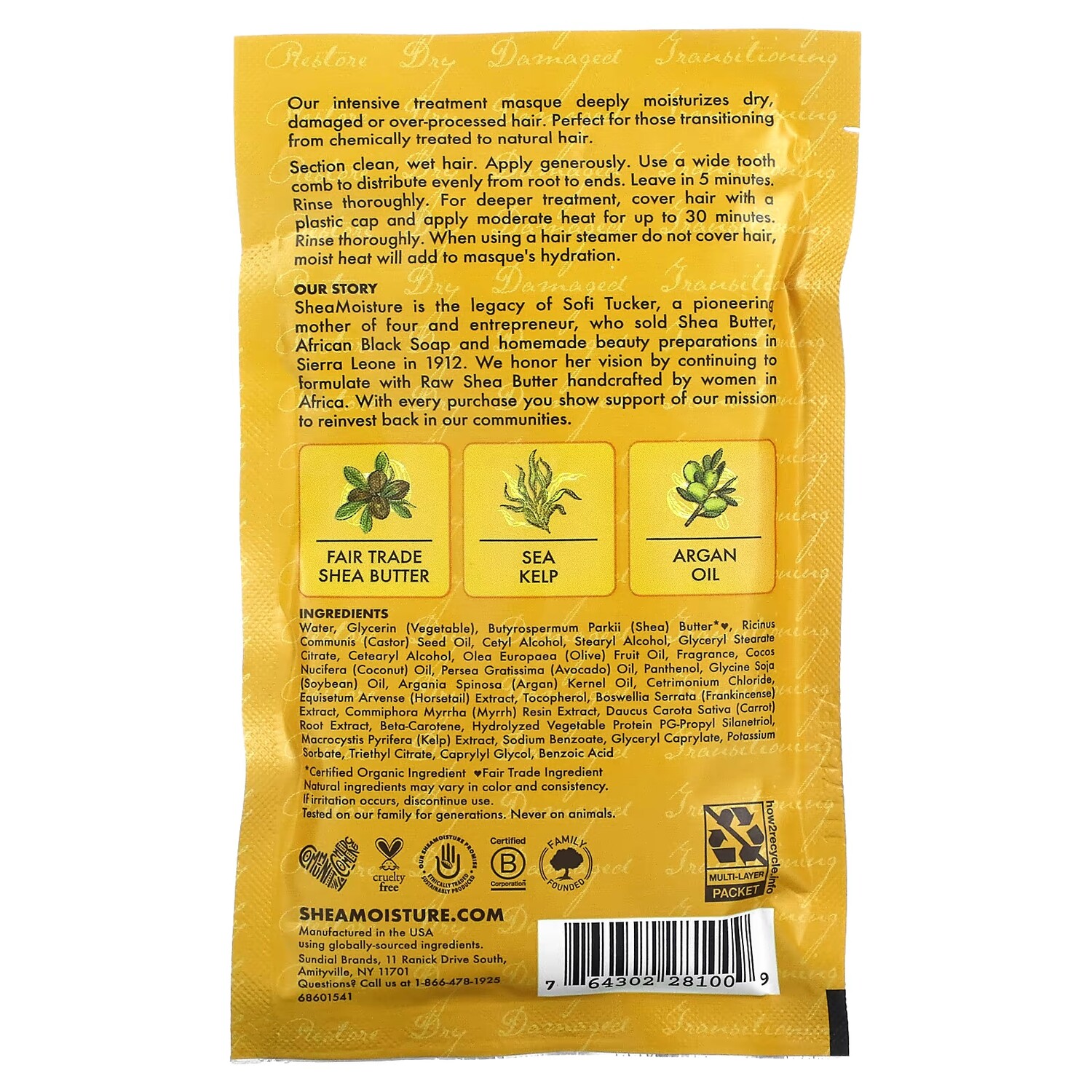 Компания основана в 1912 году Укрепление и восстановление Сухие, поврежденные или отрастающие волосы после химической обработки Содержит масло ши, которое закупается на основе принципов справедливой торговли Подходит для окрашенных волос Этичный продукт Гарантия от компании SheaMoisture. Ингредиенты закуплены с соблюдением принципов этичной торговли. Экологически безопасное производство Сертификат B Corporation Произведено на семейном предприятии Масло ши закупается на основе принципов справедливой торговли Морские бурые водоросли Аргановое масло Протестировано несколькими поколениями нашей семьи. Продукт никогда не тестировался на животных Не содержит Без фталатов Без парабенов Минерального масла Не тестируется на животных Без вазелина Наша интенсивная лечебная маска глубоко увлажняет сухие, поврежденные и подвергающиеся чрезмерной укладке волосы. Идеально подходит для перехода к природному состоянию волос после их химической обработки. Наша история Shea Moisture — наследие Софи Такер, матери четверых детей, новатора и предпринимателя, которая продавала масло ши, африканское черное мыло и домашние косметические средства в Сьерра-Леоне в 1912 году. Мы уважаем ее идеи, продолжая использовать необработанное масло ши, созданное вручную женщинами в Африке. Каждая ваша покупка демонстрирует поддержку нашей миссии по инвестированию в развитие наших сообществ.