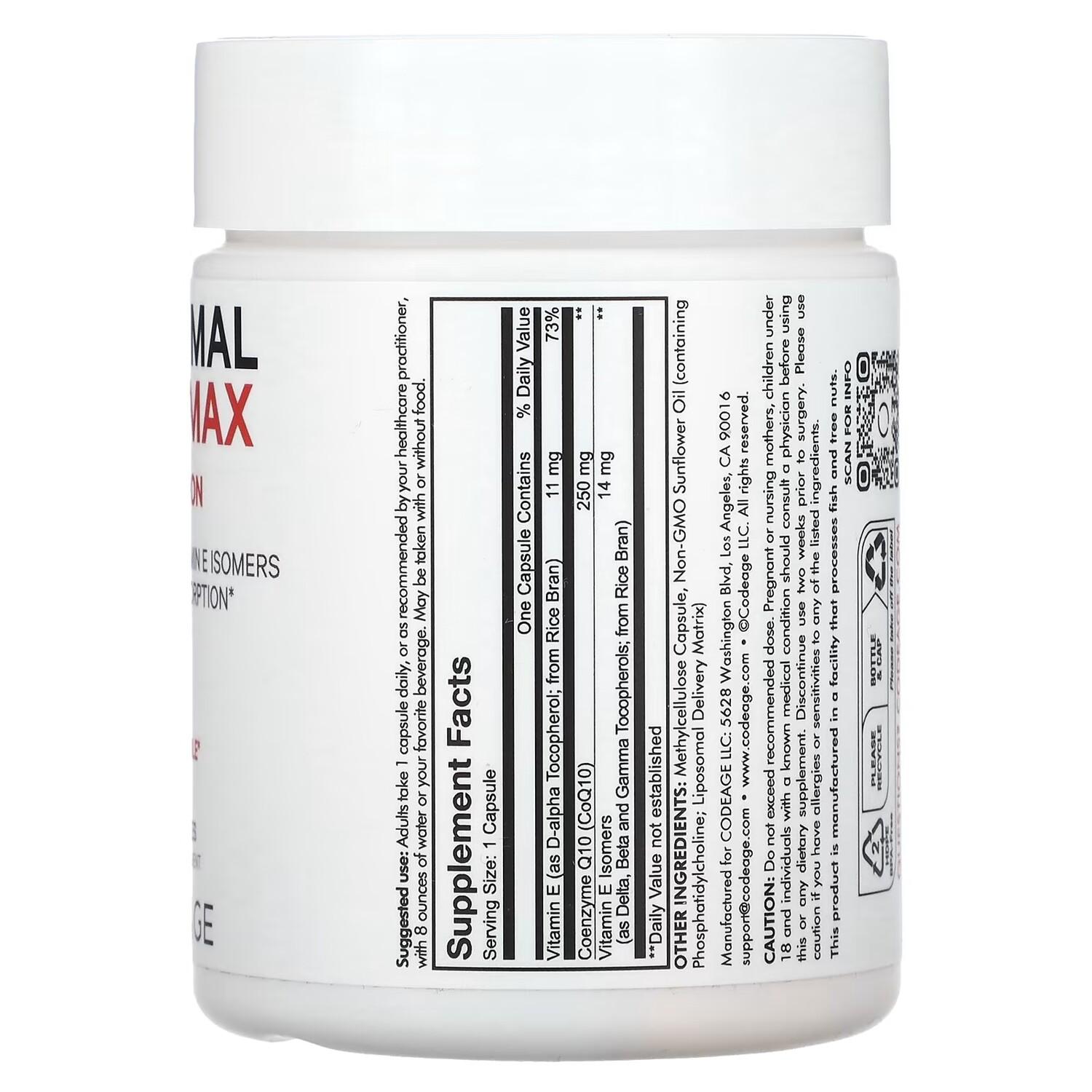 Коэнзим Q10 - улучшенное усвоение изомеров витамина Е Биодоступно Пищевая добавка Биодоступный коэнзим Q10 Незаменимые фосфолипиды Веганский продукт Без ГМО Без сои Не содержит молочных продуктов Без глютена Производство, имеющее сертификат соответствия стандартам текущей надлежащей производственной практики (cGMP) Другое самочувствие Не содержит бисфенола А Codeage Liposomal CoQ10 Max содержит 250 мг коэнзима Q10 на порцию, употребляемую всего в одной капсуле в день. Эта усовершенствованная добавка с коэнзимом Q10 также содержит изомеры витаминов E и E, которые помогают поддерживать здоровье сердца и выработку энергии. Эта формула CoQ10 поставляется в липосомальной форме, чтобы повысить его биодоступность.