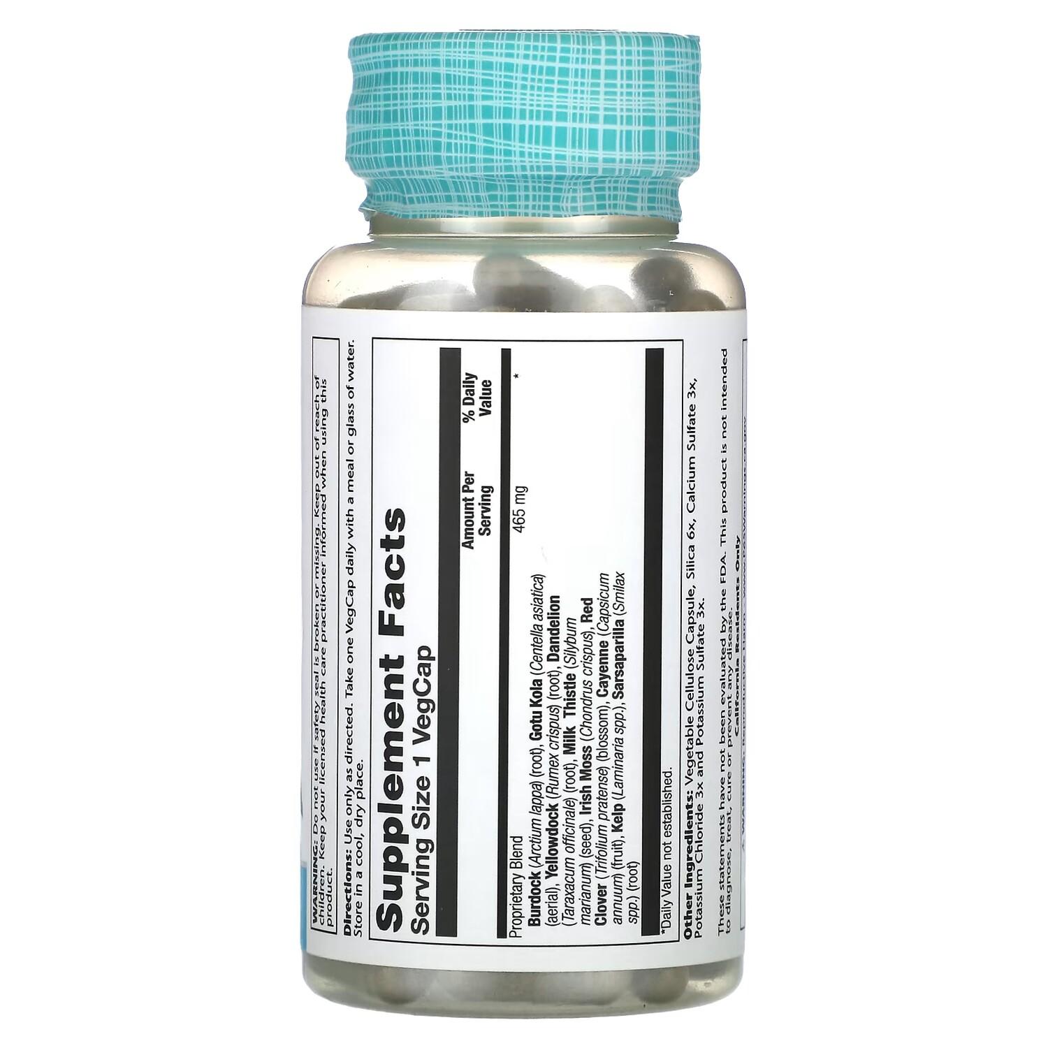 Пищевая ценностьРазмер порции: 1 вегетарианская капсула Количество в 1 порции% от суточной нормыЗапатентованная смесьЛопух (Arctium lappa) (корень), готу кола (Centella asiatica) (надземная), желтокорень (Rumex crispus) (корень), одуванчик (Taraxacum officinale) (корень), расторопша пятнистая (Silybum marianum) (семена), ирландский мох ( Chondrus crispus), красный клевер (Trifolium pratense) (цветки), кайенский перец (Capsicum annuum) (плоды), водоросли (Laminaria ssp.) Сарсапарилла (Smilax ssp.) (Корень)465 мг** Суточная норма не определена.