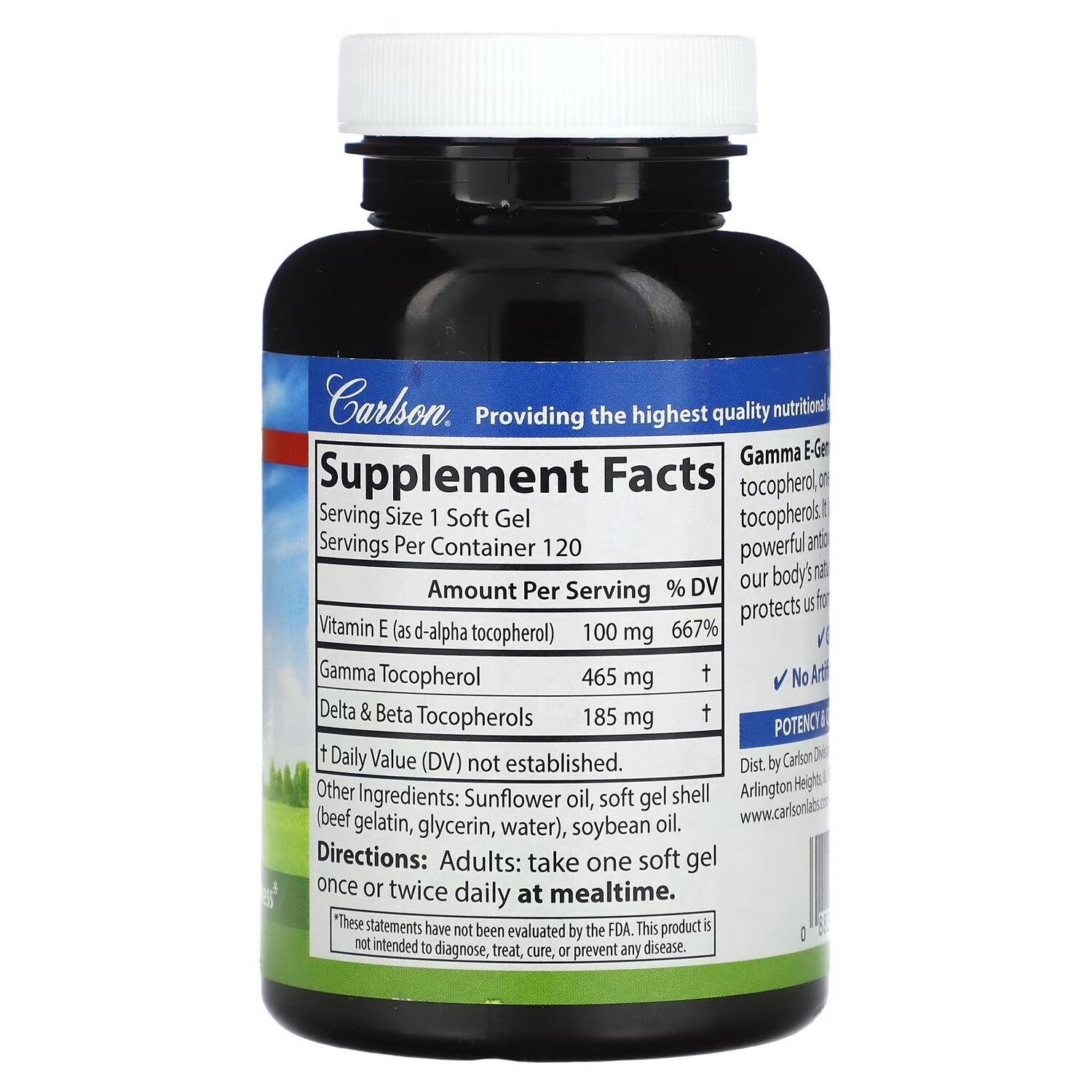 Пищевая ценностьРазмер порции: 1 капсулаПорций в упаковке: 120 Количество в 1 порции% от суточной нормыВитамин E (в виде d-альфа-токоферола)100 мг667%Гамма-токоферол465 мг†Дельта- и бета-токоферолы 185 мг† † Суточная норма не определена.