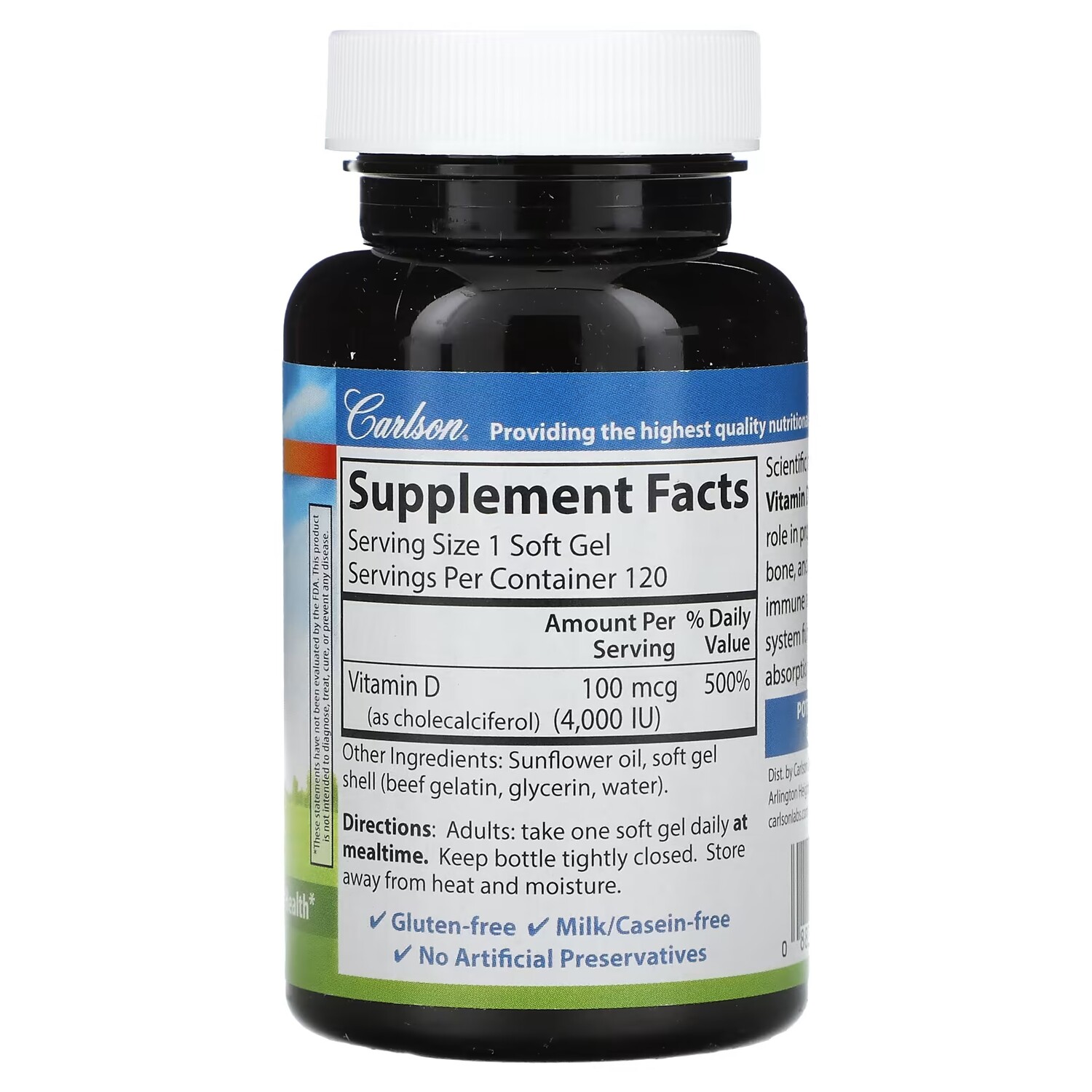 Отсутствие ГМО в составе подтверждено сертификатом IGEN – Non-GMO Tested 100 мкг (4000 МЕ) Пищевая добавка Поддержка костей Укрепление иммунитета Здоровье сердца Гарантия качества и эффективности Без глютена Без молочных продуктов/казеина Не содержит искусственных консервантов Компания Carlson поставляет пищевые добавки высочайшего качества с 1965 года. Научные исследования показывают, что витамин D3 играет важную роль в укреплении зубов, костей и мышц, работе иммунной и сердечно-сосудистой систем, а также влияет на усвояемость кальция.
