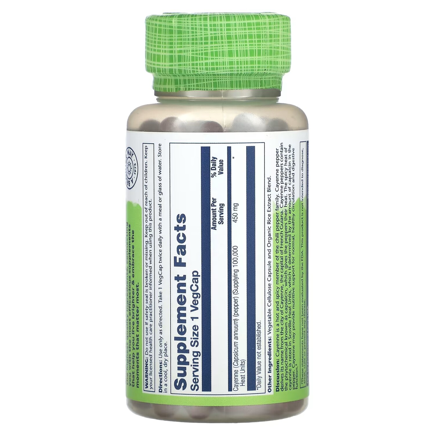 Пищевая ценностьРазмер порции: 1 вегетарианская капсула Количество в 1 порции% от суточной нормыКайенский перец (Capsicum annuum) (перец) (содержит 100000 единиц сердца)450 мг** Суточная норма не определена.