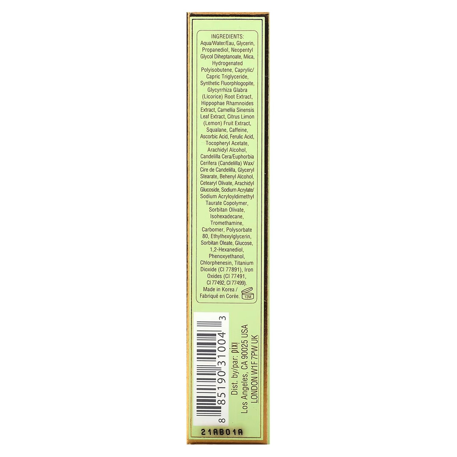 Вода, глицерин, пропандиол, неопентилгликоль дигептаноат, слюда, гидрогенизированный полиизобутен, каприловый / каприновый триглицерид, синтетический фторфлогопит, экстракт корня солодки (Glycyrrhiza glabra), экстракт бегемота рамноидес, экстракт листьев зеленого чая (Camellia sinensis), экстракт плодов лимона (Citrus limon), сквалан, кофеин, аскорбиновая кислота, феруловая кислота, токоферилацетат, арахидиловый спирт, канделильский воск (Candelilla cera), глицерил стеарат, бегениловый спирт, цетеарил оливат, арахидиловый глюкозид, сополимер акрилата натрия / акрилоилдиметилтаурата натрия, сорбитан оливат, изогексадекан, трометамин, карбомер, полисорбат 80, этилгексилглицерин, сорбитанолеат, глюкоза, 1,2-гександиол, феноксиэтанол, хлорфенезин, диоксид титана (CI 77891), оксиды железа (CI 77491, CI 77492, CI 77499).