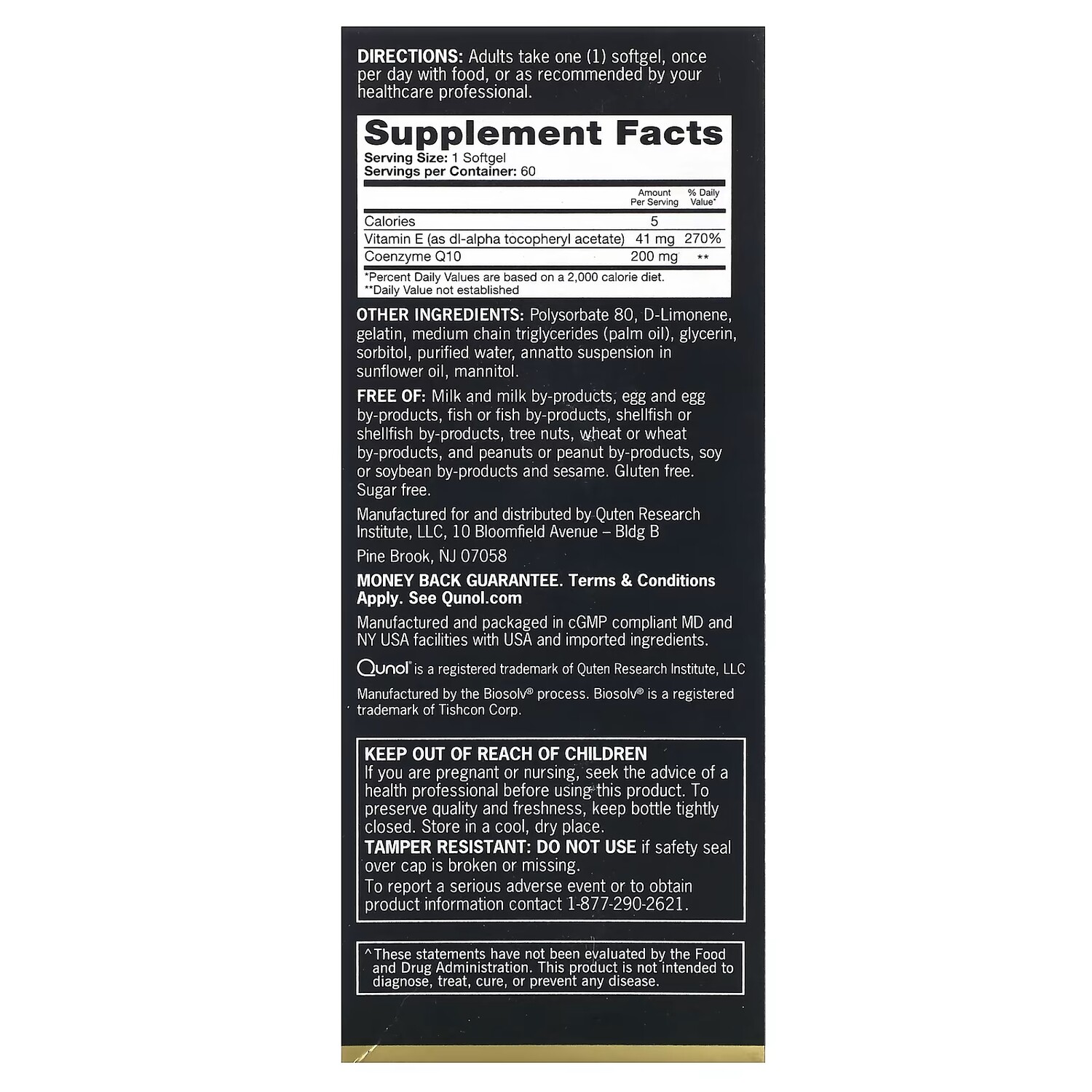 Пищевая ценностьРазмер порции: 1 мягкая таблеткаПорций в упаковке: 60 Количество в 1 порции% от суточной нормы*Калории5 Витамин E (в виде dl-альфа токоферилацетата)41 мг 270% Коэнзим Q10200 мг ** * Процент от суточной нормы при условии потребления 2000 калорий в день.** Суточная норма не определена.