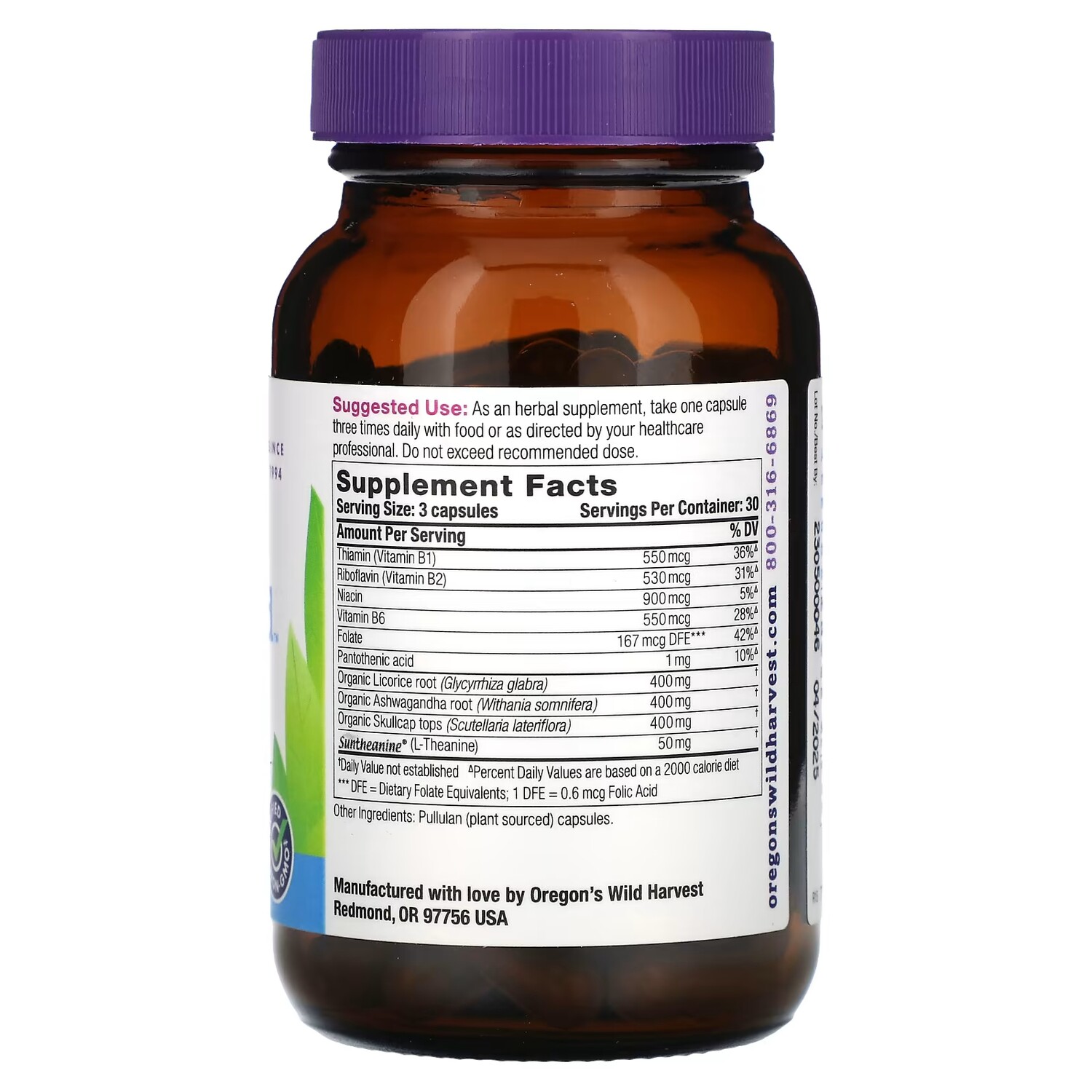 Пищевая ценностьРазмер порции: 3 капсулыПорций в упаковке: 30 Количество в 1 порции% от суточной нормыТиамин (витамин B1)550 мкг36%△Рибофлавин (витамин B2)530 мкг31%△Ниацин900 мкг5%△Витамин B6550 мкг28%△Фолат167 мкг DFE ***42%△Пантотеновая кислота1 мг10%△Органический корень солодки (Glycyrrhiza glabra)400 мг†Органический корень ашваганды (Withania somnifera)400 мг†Органические шлемники (Scutellaria lateriflora)400 мг†Suntheanine (L-теанин)50 мㆆ Суточная норма не определена.△Процент от суточной нормы при условии потребления 2000 калорий в день.*** DFE - пищевые эквиваленты фолата; 1 DFE = 0,6 мкг фолиевой кислоты