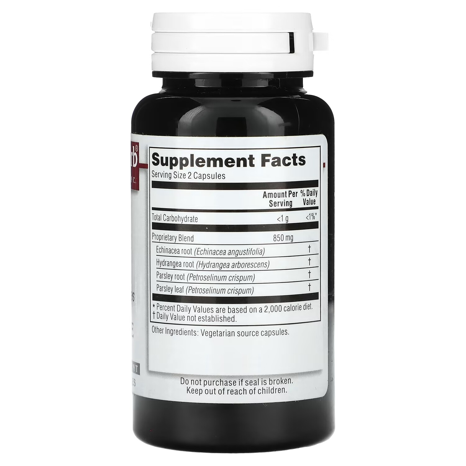 Пищевая ценностьРазмер порции: 2 капсулы Количество в 1 порции% от суточной нормыВсего углеводов< 1 г <1%* Запатентованная смесь850 мг Корень эхинацеи (Echinacea angustifolia) † Корень гортензии (Hydrangea arborescens) † Корень петрушки (Petroselinum crispum) † Листья петрушки (Petroselinum crispum) † * Процент от суточной нормы при условии потребления 2000 калорий в день.† Суточная норма не определена.