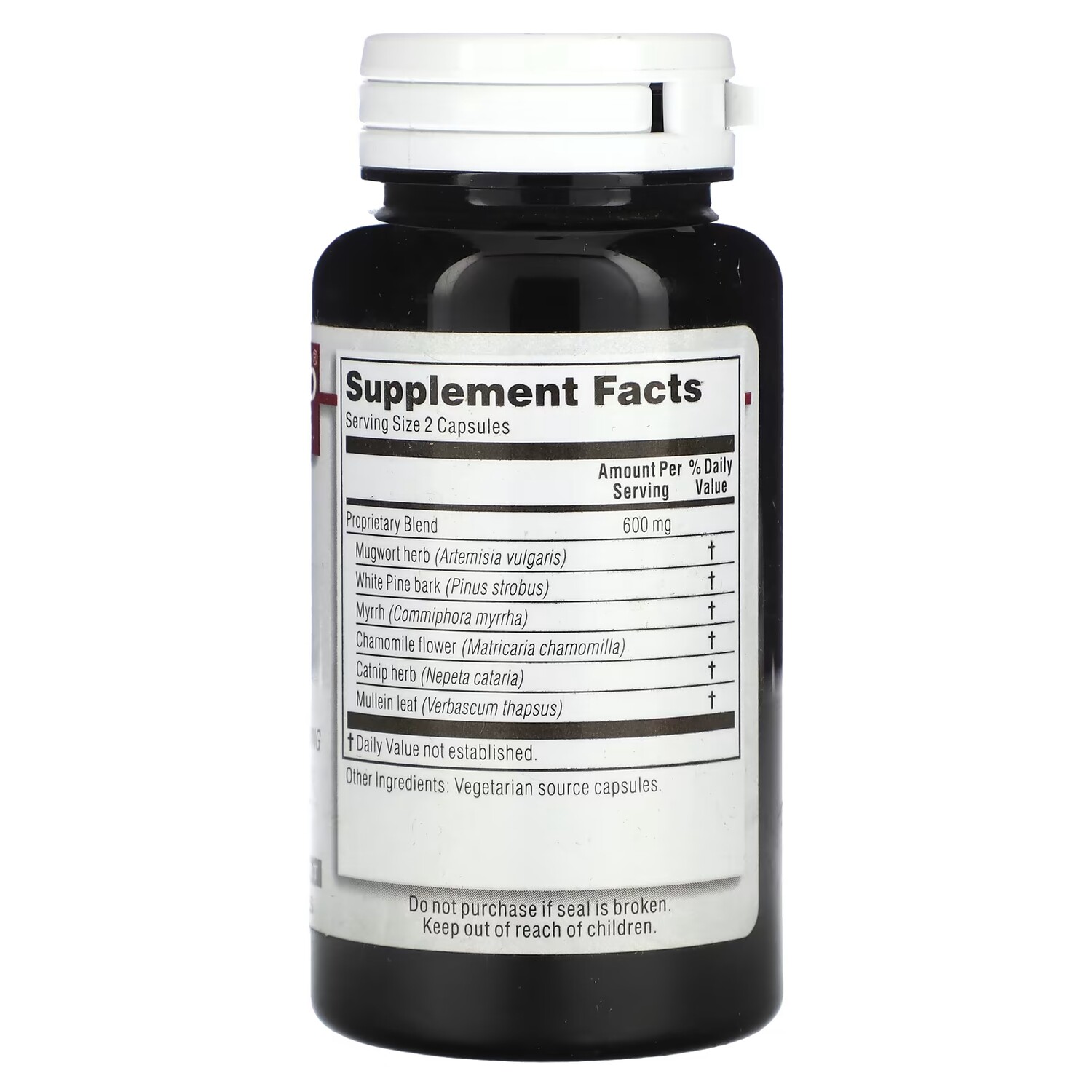 Пищевая ценностьРазмер порции: 2 капсулы Количество в 1 порции% от суточной нормыЗапатентованная смесь600 мг Полынь обыкновенная (Artemisia vulgaris) †Кора белой сосны (Pinus strobus) †Мирра (Commiphora myrrha) †Цветки ромашки (Matricaria chamomilla) †Кошачья мята (Nepeta cataria) †Лист коровяка (Verbascum thapsus) †† Суточная норма не определена.