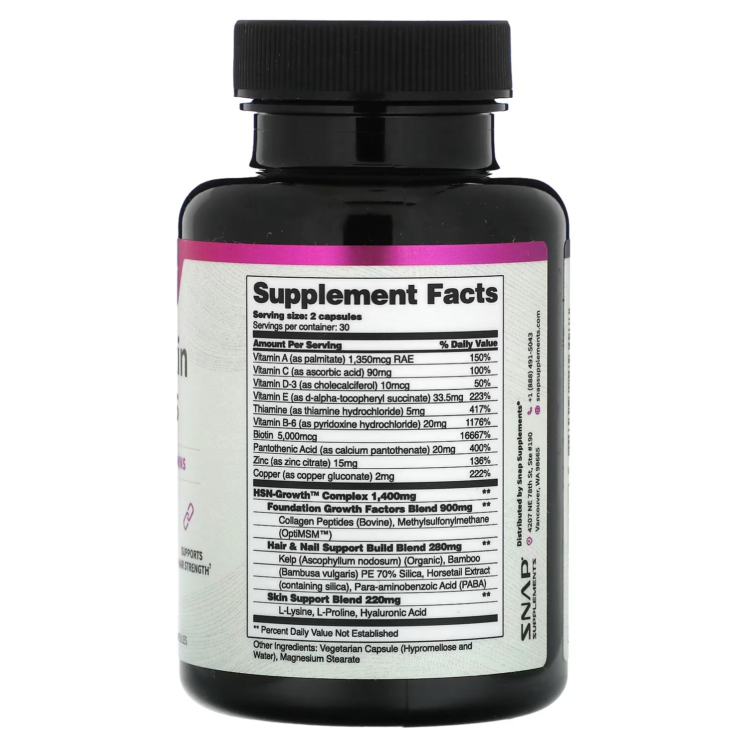 Пищевая ценностьРазмер порции: 2 капсулыПорций в упаковке: 30 Количество в 1 порции% от суточной нормыВитамин A (в виде пальмитата)1350 мкг RAE150%Витамин C (в виде аскорбиновой кислоты)90 мг 100%Витамин D3 (в виде холекальциферола)10 мкг 50%Витамин E (в виде d-альфа-токоферила сукцината)33,5 мг223%Тиамин (в виде тиамина гидрохлорида)5 мг417%Витамин B6 (в виде пиридоксина гидрохлорида)20 мг 1176%Биотин 5000 мкг 16 667%Пантотеновая кислота (в виде пантотената кальция)20 мг 400%Цинк (в виде цитрата цинка)15 мг 136%Медь (в виде глюконата меди)2 мг222%Комплекс HSN-Growth1400 мг **Смесь Foundation Growth FactorsПептиды коллагена (бычьего), метилсульфонилметан (OptiMSM)900 мг **Смесь для поддержки роста волос и ногтейБурые водоросли (Ascophyllum nodosum) (органические), бамбук и бамбук (Bambusa vulgaris) ПЭ (70% диоксида кремния), экстракт хвоща (с диоксидом кремния), пара-аминобензойная кислота (ПАБК)280 мг **Смесь для поддержки кожиL-лизин, L-пролин, гиалуроновая кислота220 мг **** Процент от суточной нормы не определен