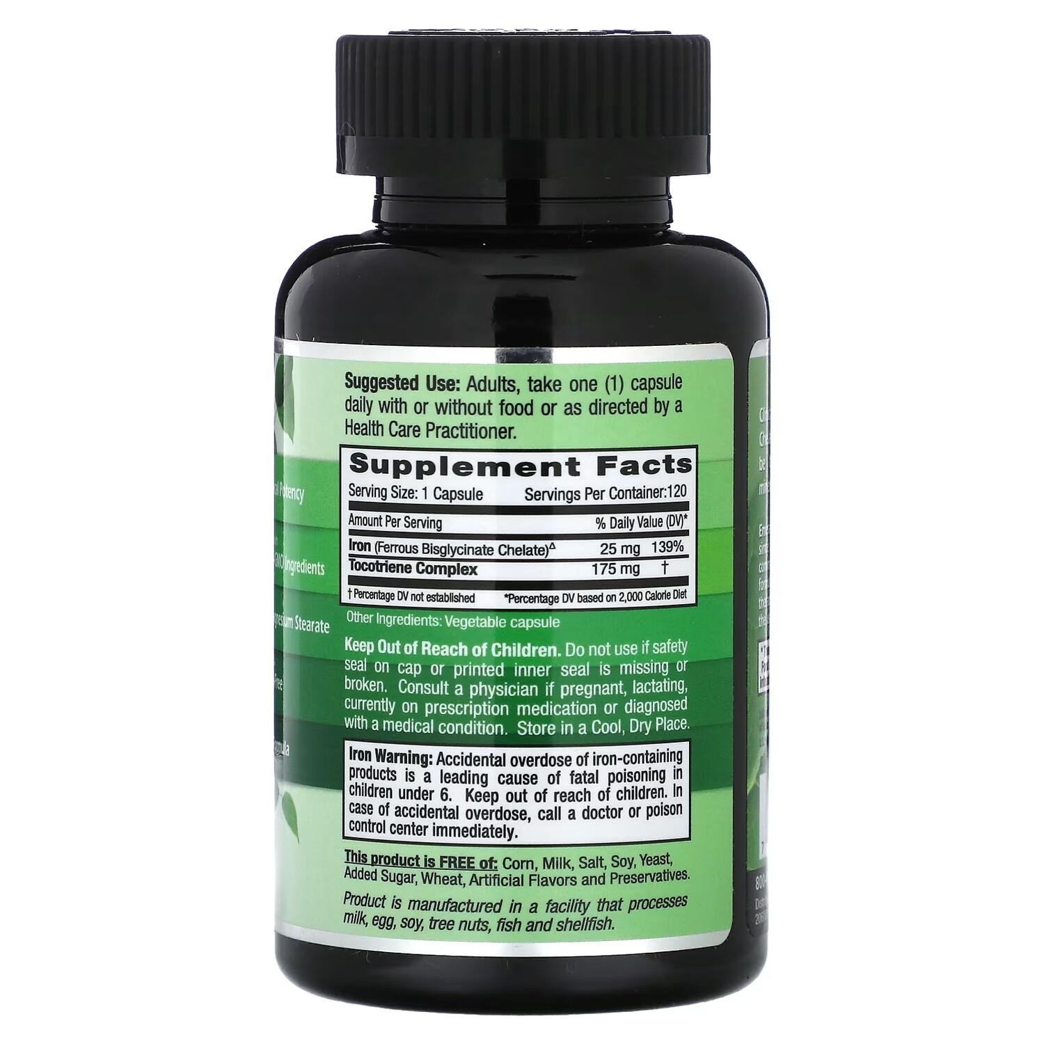Пищевая ценностьРазмер порции: 1 капсулаПорций в упаковке: 120 Количество в 1 порции% от суточной нормы*Железо (хелат бисглицината железа)△25 мг139%Комплекс токотриенов175 мг†* Процент от суточной нормы при условии потребления 2000 калорий в день.† Процент от суточной нормы не определен.