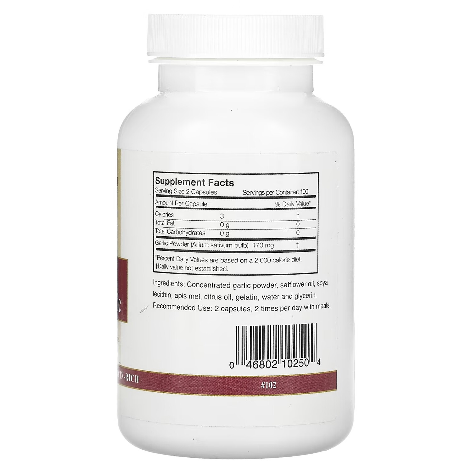 Пищевая ценностьРазмер порции: 2 капсулыПорций в упаковке: 100Количество в 1 порции% от суточной нормы*Калории3†Всего жиров0 г0%Всего углеводов0 г0Чесночный порошок (луковица Allium sativum)170 мг†* Процент от суточной нормы при условии потребления 2000 калорий в день.† Суточная норма не определена.