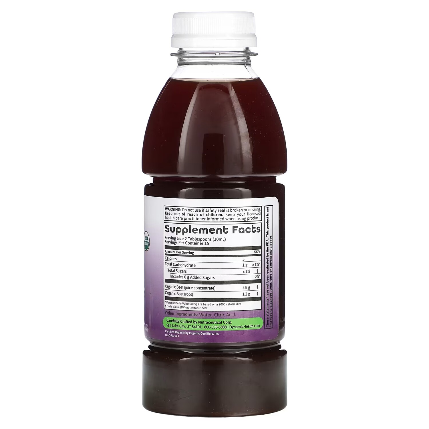 Пищевая ценностьРазмер порции: 2 столовые ложки (30 мл)Порций в упаковке: 15 Количество в 1 порции% ОТ СУТОЧНОЙ НОРМЫКалории5 Всего углеводов1 г< 1%*Всего сахара< 1%†Содержит 0 г добавленного сахара0%*Органическая свекла (концентрат сока)5,8 г†Органическая свекла (корнеплод)1,2 г†* Процент от суточной нормы при условии потребления 2000 калорий в день.† Суточная норма не определена.