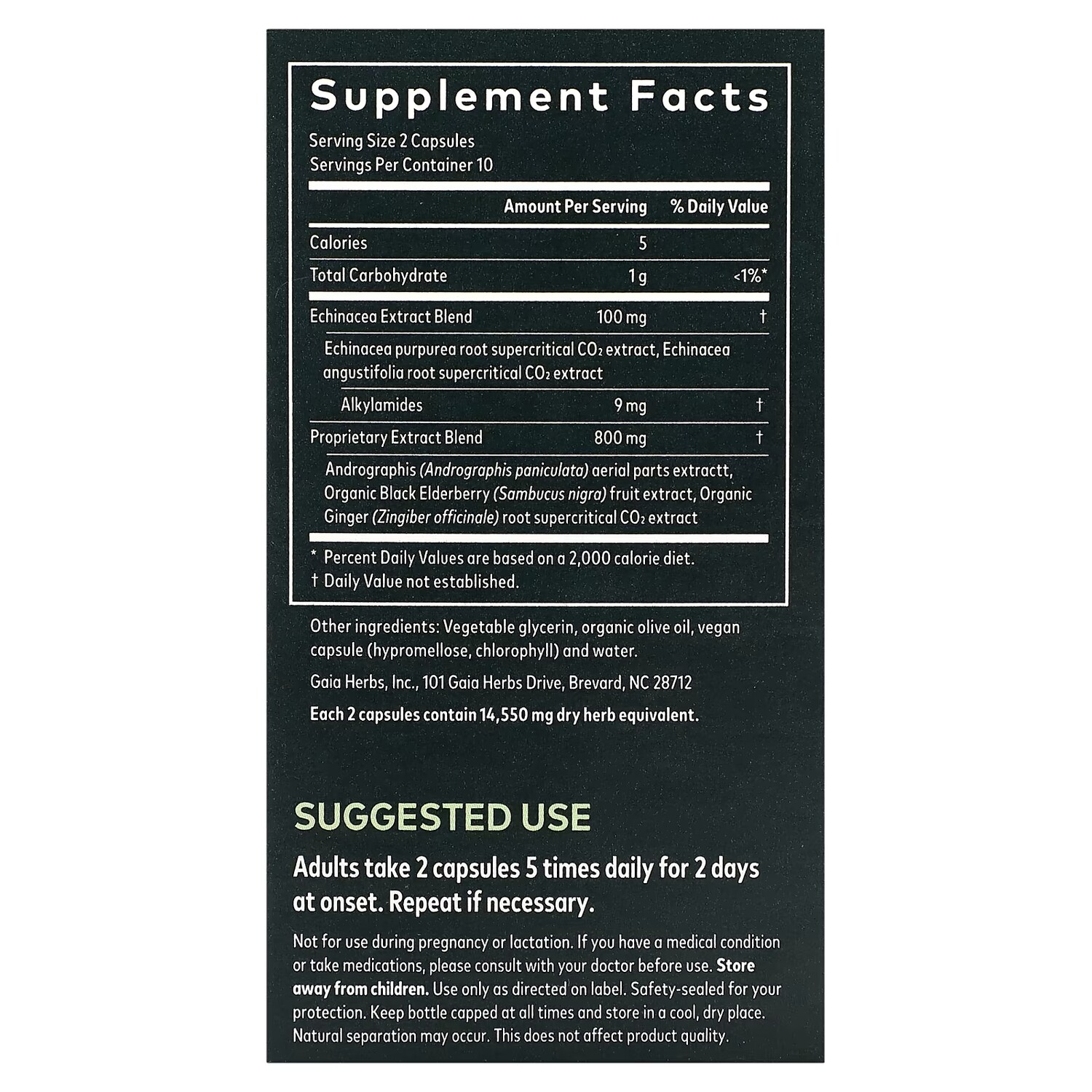 Пищевая ценностьРазмер порции: 2 капсулыПорций в упаковке: 10 Количество в 1 порции% от суточной нормыКалории5 Всего углеводов1 г<1%*Смесь экстрактов эхинацеиСверхкритический экстракт корня эхинацеи (Echinacea purpurea), CO2-экстракт, сверхкритический CO2-экстракт корня эхинацеи узколистной100 мг+Алкиламиды9 мг†Запатентованная смесь экстрактов800 мг†Экстракт надземных частей андрографиса (Andrographis paniculata), экстракт плодов органической черной бузины (Sambucus nigra), сверхкритический CO2-экстракт корня органического имбиря (Zingiber officinale).* Процент от суточной нормы при условии потребления 2000 калорий в день.† Суточная норма не определена.Каждые 2 капсулы содержат 14 550 мг эквивалента сухих трав.
