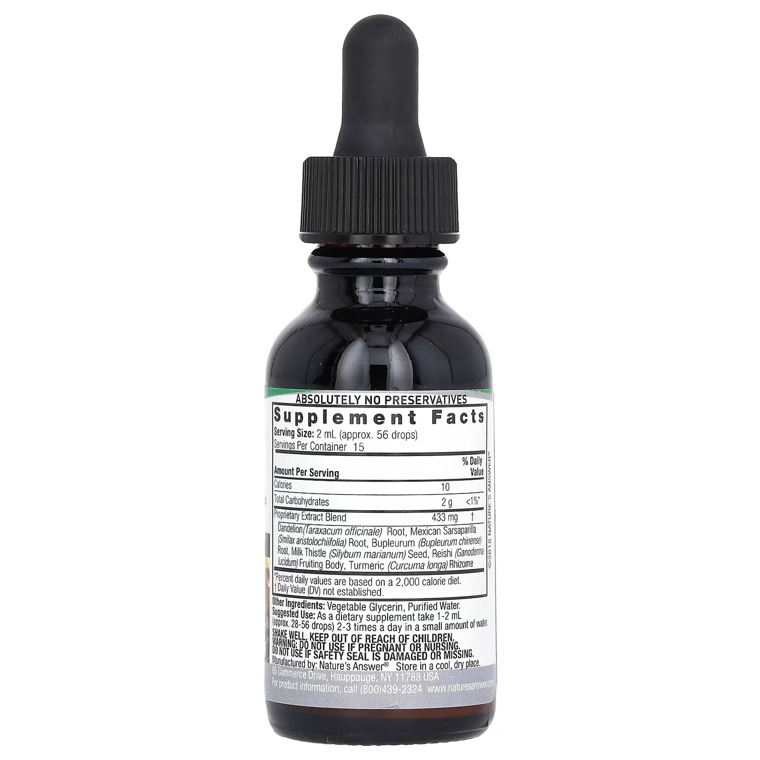 Пищевая ценностьРазмер порции: 2 мл (прибл. 56 капель)Порций в упаковке: 15 Количество в 1 порции% от суточной нормыКалории10Всего углеводов2 г< 1%*Запатентованная смесь экстрактовкорень одуванчика (Taraxacum officinale), корень мексиканской сарсапарели (Smilax aristolochiifolia), корень володушки (bupleurum chinense), семена расторопши пятнистой (Silybum marianum), плодовое тело рейши (Ganoderma lucidum), корневище куркумы (Curcuma longa)​433 мг†* Процент от суточной нормы при условии потребления 2000 калорий в день. † Суточная норма не определена.