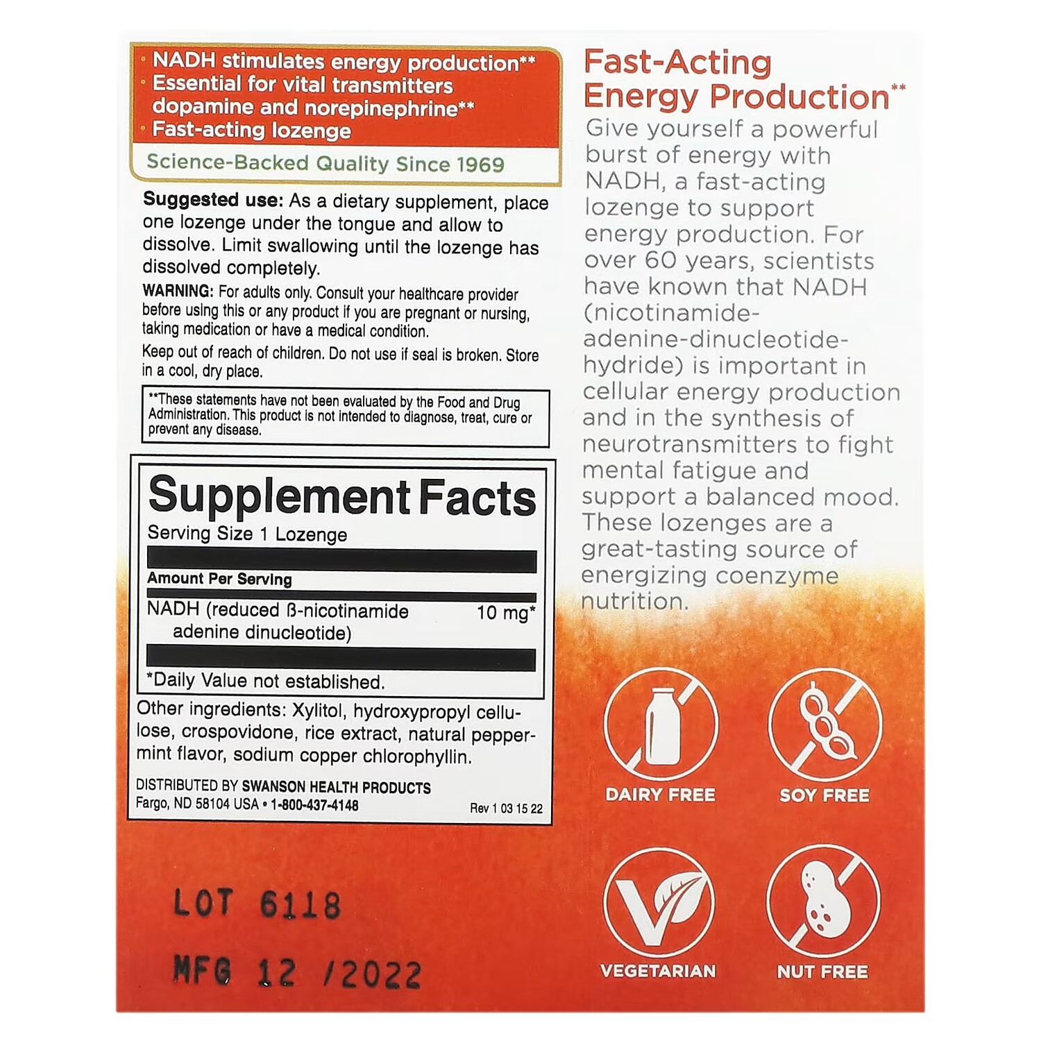 Не является лекарственным средством. Пищевая добавка. Не содержит молочных продуктов. Не содержит сои. Без орехов. Быстродействующее производство энергии. Подарите себе мощный заряд энергии с помощью NADH, быстродействующей пастилки для поддержки выработки энергии.