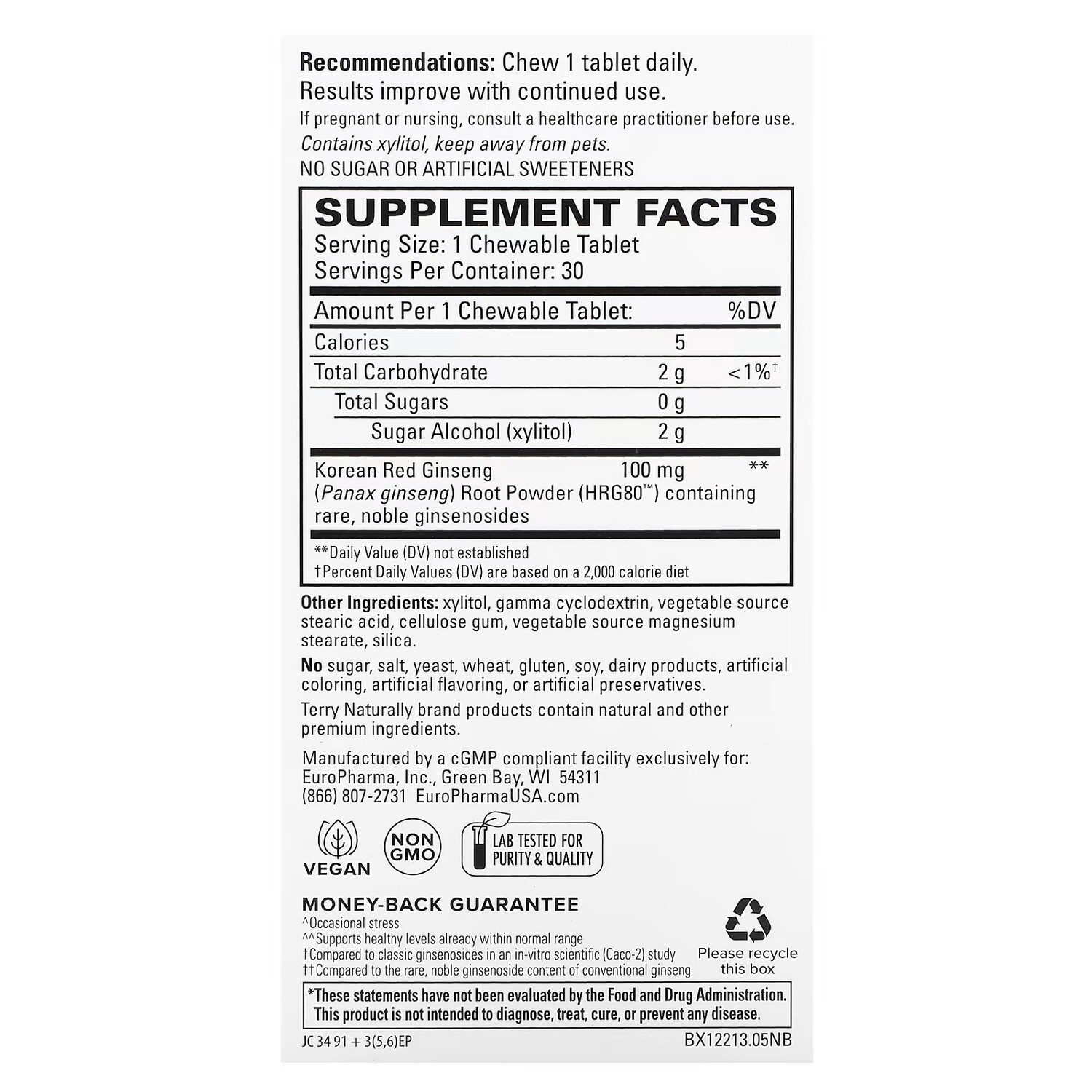 Добавка Terry Naturally HRG80 Red Ginseng Energy, 30 жевательных таблеток