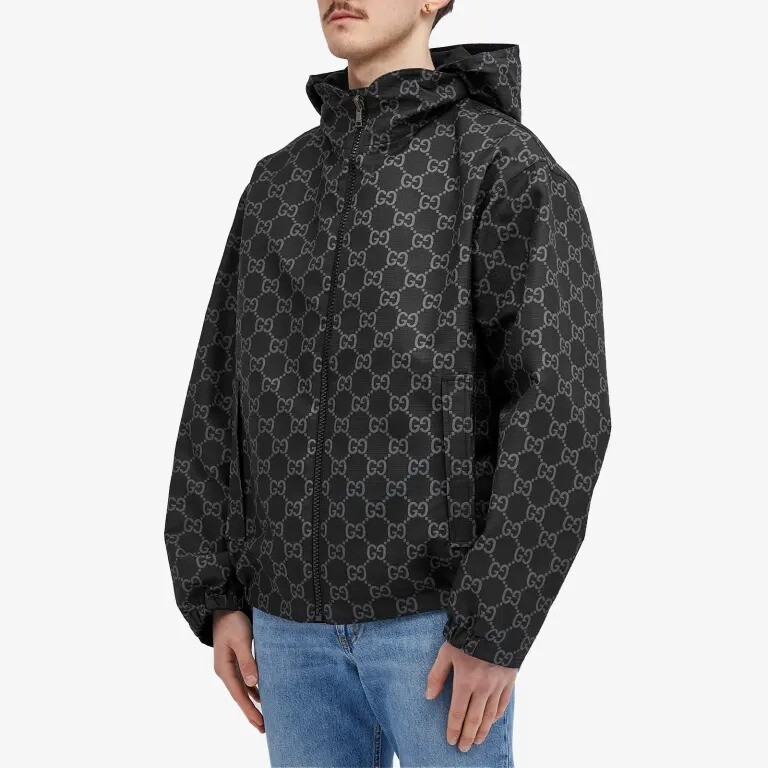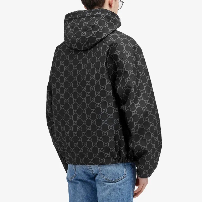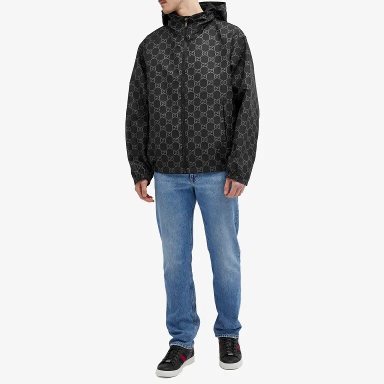 Оличительной чертой этой куртки является двусторонность, выполненная из черного нейлона ripstop с одной стороны и серого нейлона GG ripstop с другой. Благодаря скрытому капюшону и кожаной нашивке вы сможете менять свой образ в течение дня.