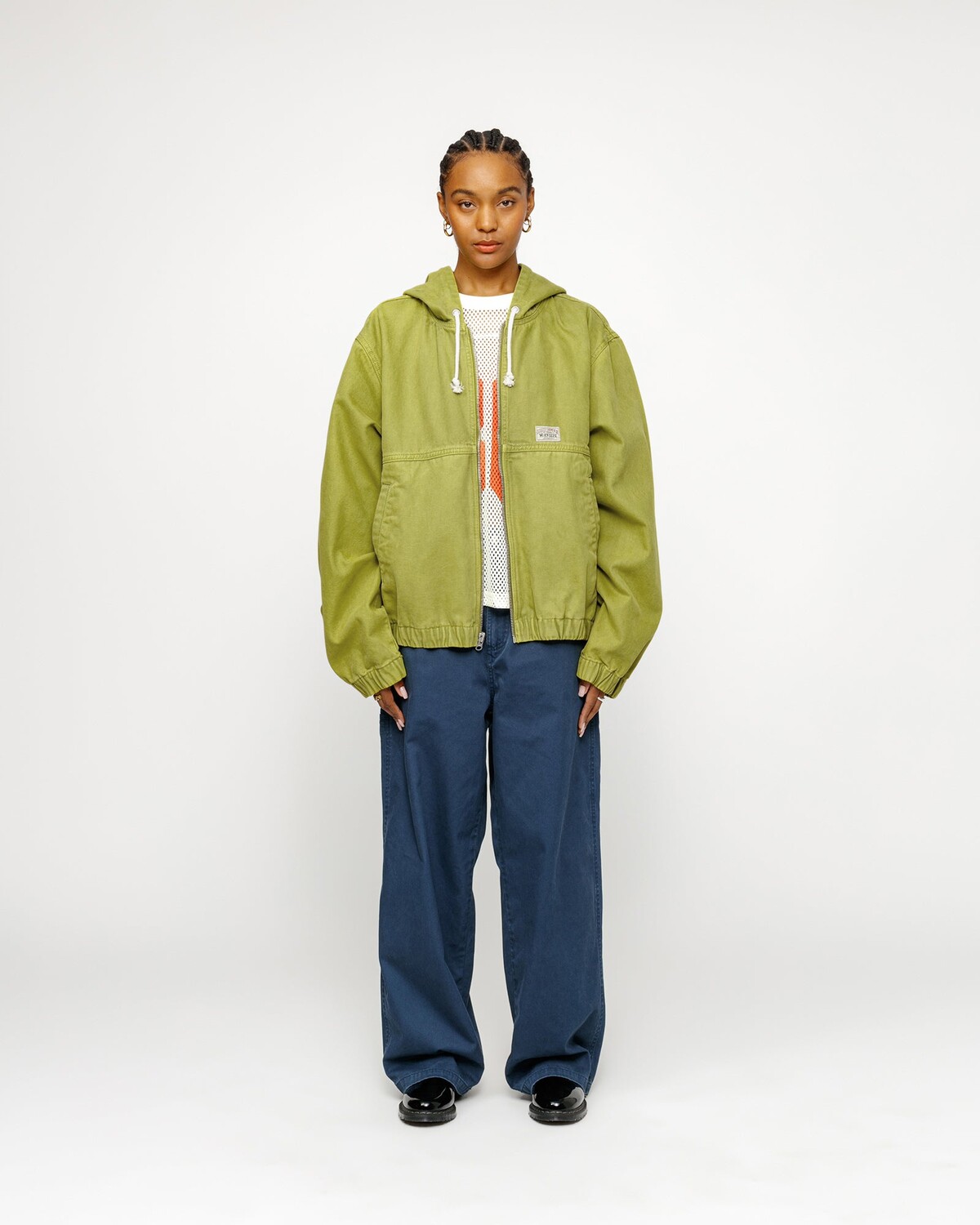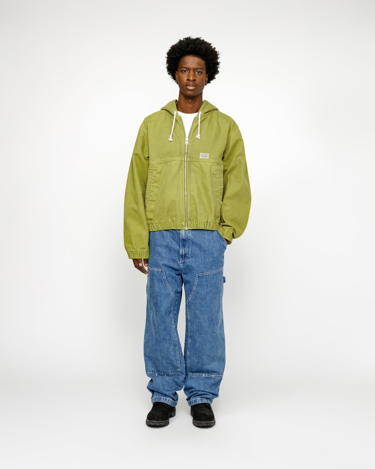 Рабочая куртка с капюшоном из хлопковой парусины с эффектом потертости, без подкладки. Свободный крой с застежкой-молнией спереди и прорезными карманами. Вытканная спереди аутентичная этикетка Stüssy для спецодежды.