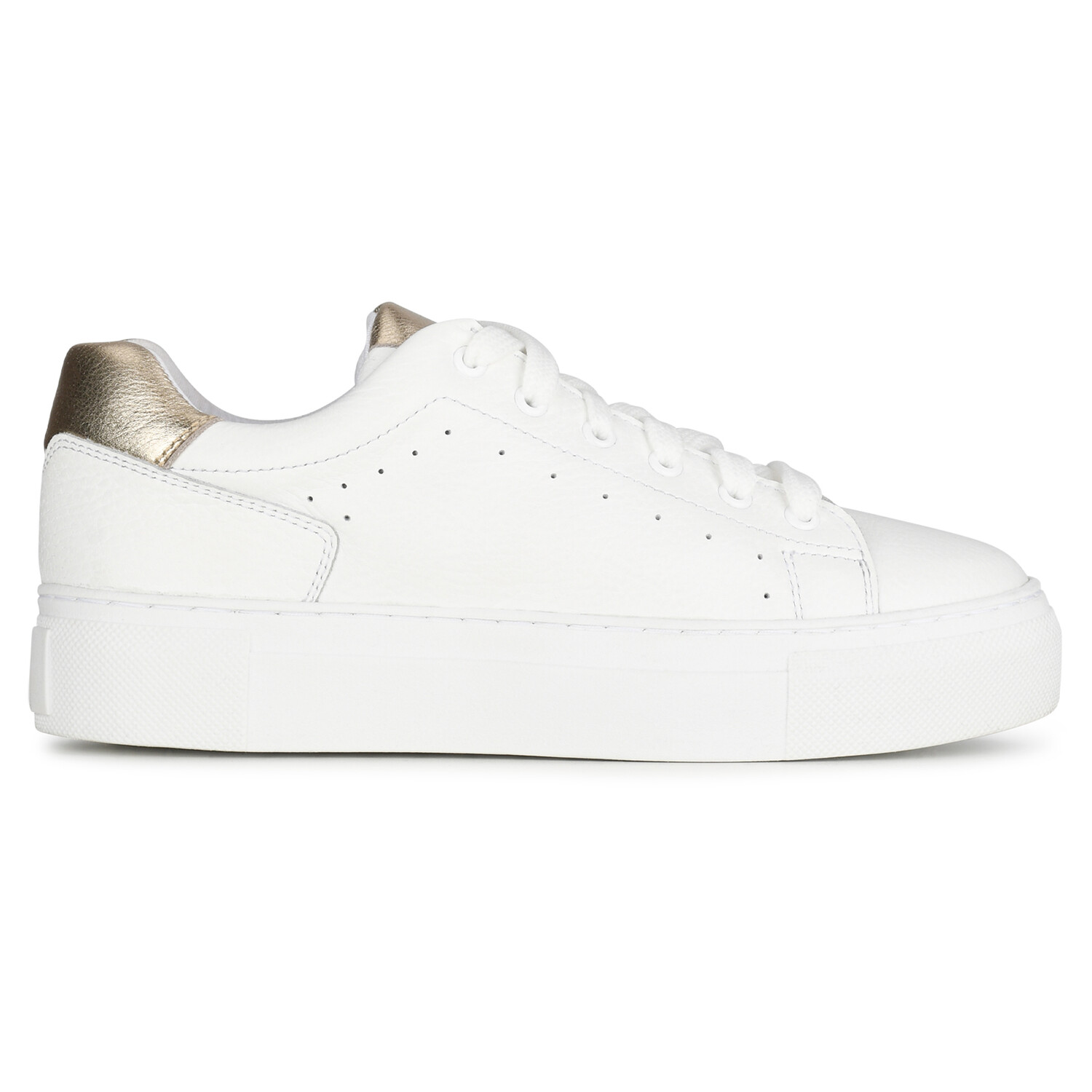 Женские кроссовки TITULAR от PS Poelman имеют верх из мятой кожи белого цвета с металлизированными кожаными деталями. Модель имеет застежку на шнуровке и массивную подошву высотой 4 см. Обувь имеет текстильную подкладку и кожаную стельку.