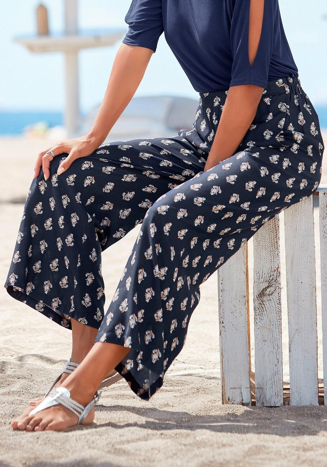 Стильные брюки-палаццо от Vivance. Удобный пояс: гладкий спереди, эластичный сзади. В форме комбинезонов, облегающих фигуру. Практичные карманы в боковых швах. Широкие, облегающие фигуру ноги. Для теплых летних дней. Мягкая, комфортная вискоза.