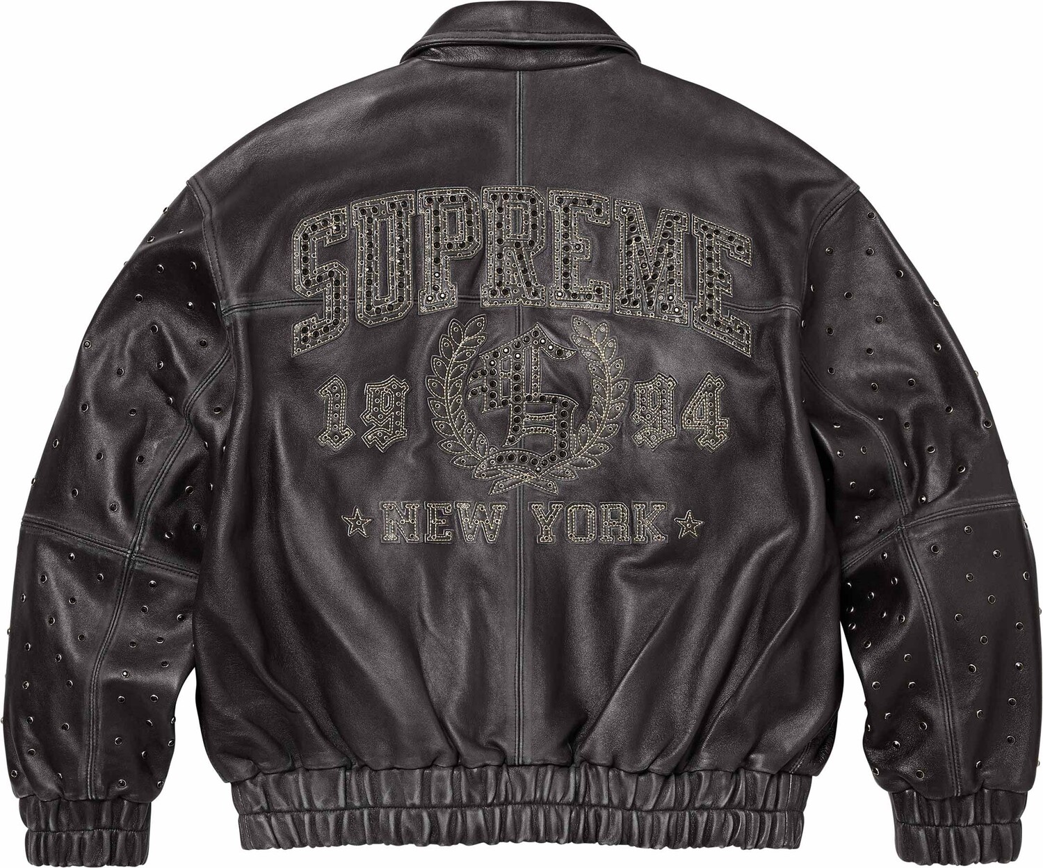 Аппликация с логотипом из кожи с драгоценными камнями на груди и спине.