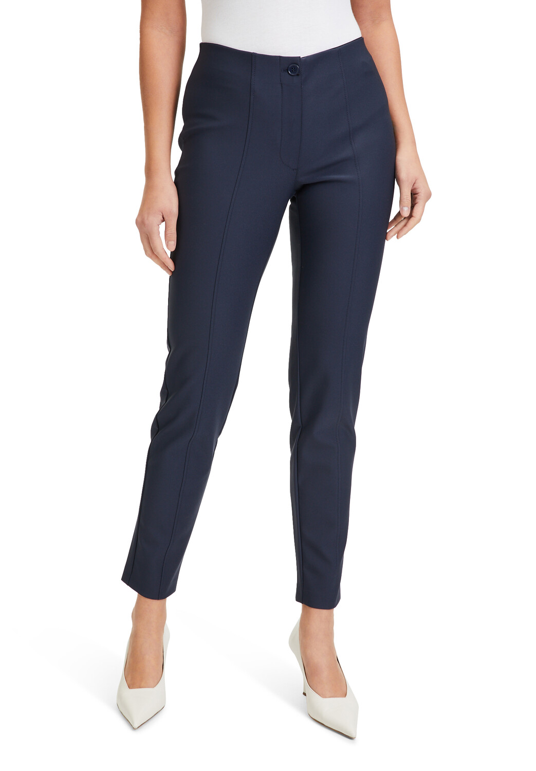 Абсолютно необходимая вещь! Деловые брюки со средней талией от Betty Barclay однотонного дизайна из мягкого материала. Современный облегающий крой делает его идеальным для повседневной офисной жизни и легко комбинируется. Карманы с окантовкой и застежка на пуговицы придают ему особую индивидуальность.