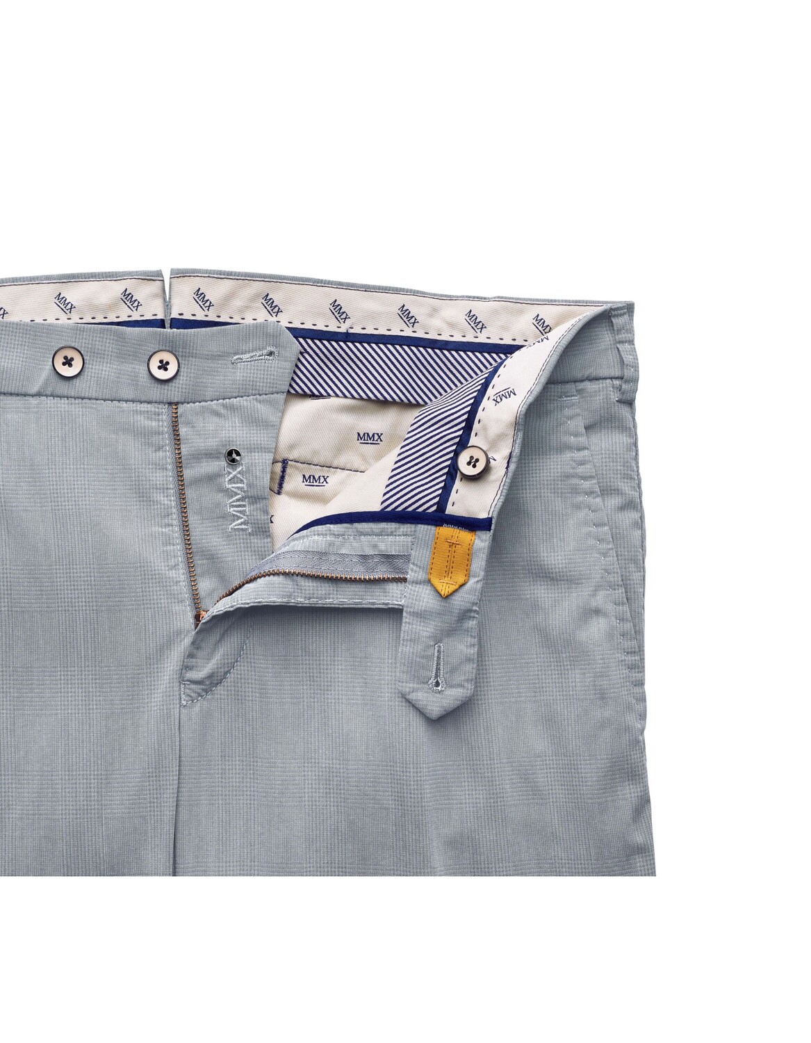 Эти облегающие летние брюки чинос в клетку приятно мягкие и обеспечивают максимальный комфорт благодаря эластичной ткани. Практичный карман для мобильного телефона гарантирует, что вам не придется беспокоиться о своем смартфоне. Полупортновской круглый пояс гарантирует идеальную посадку. Особые детали, такие как подобранная по цвету подкладка, кристалл на ширине и вышитый вручную логотип MMX, придают этим брюкам эксклюзивный внешний вид.