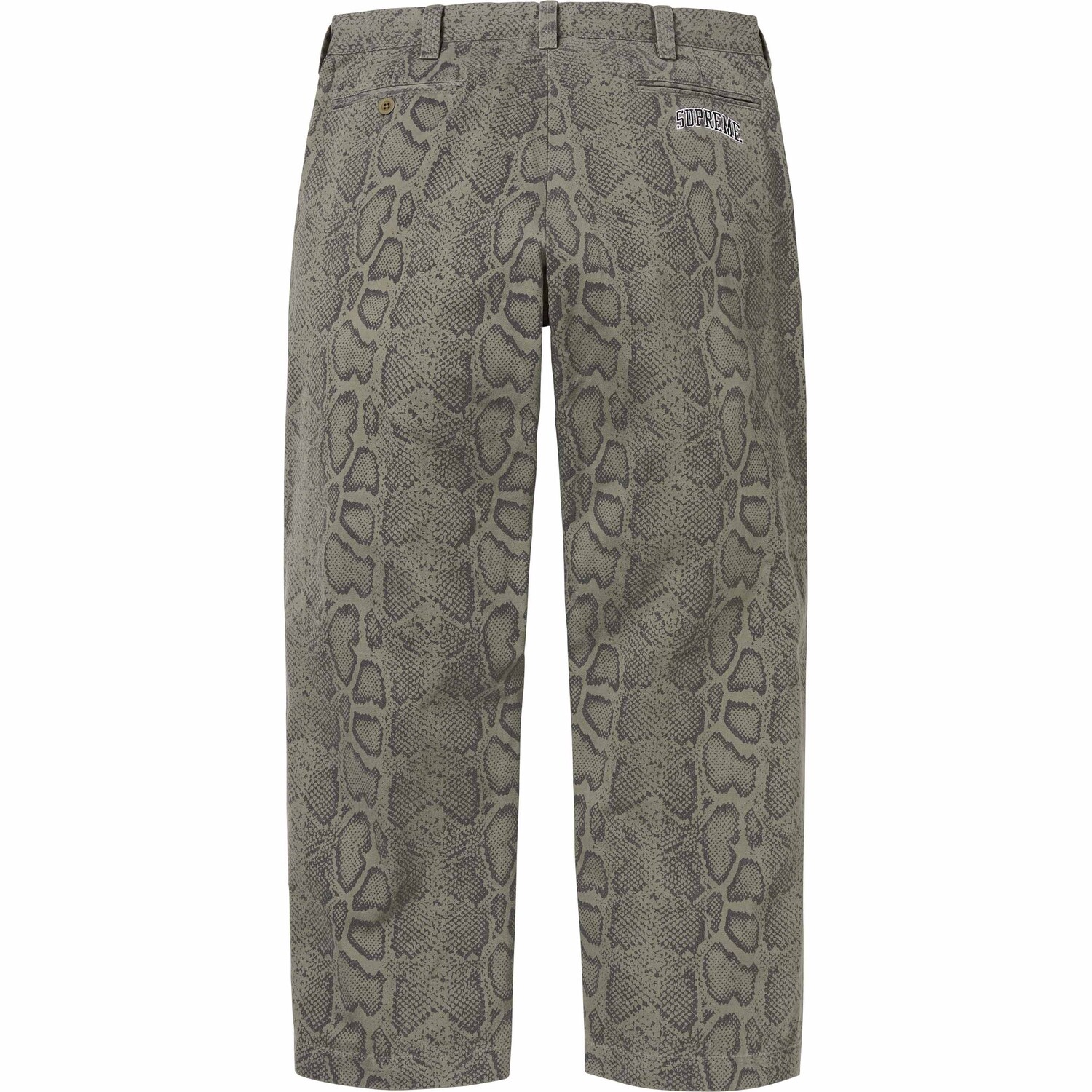 Брюки-чинос со змеиным принтом выполнены полностью из хлопковой твиловой ткани.