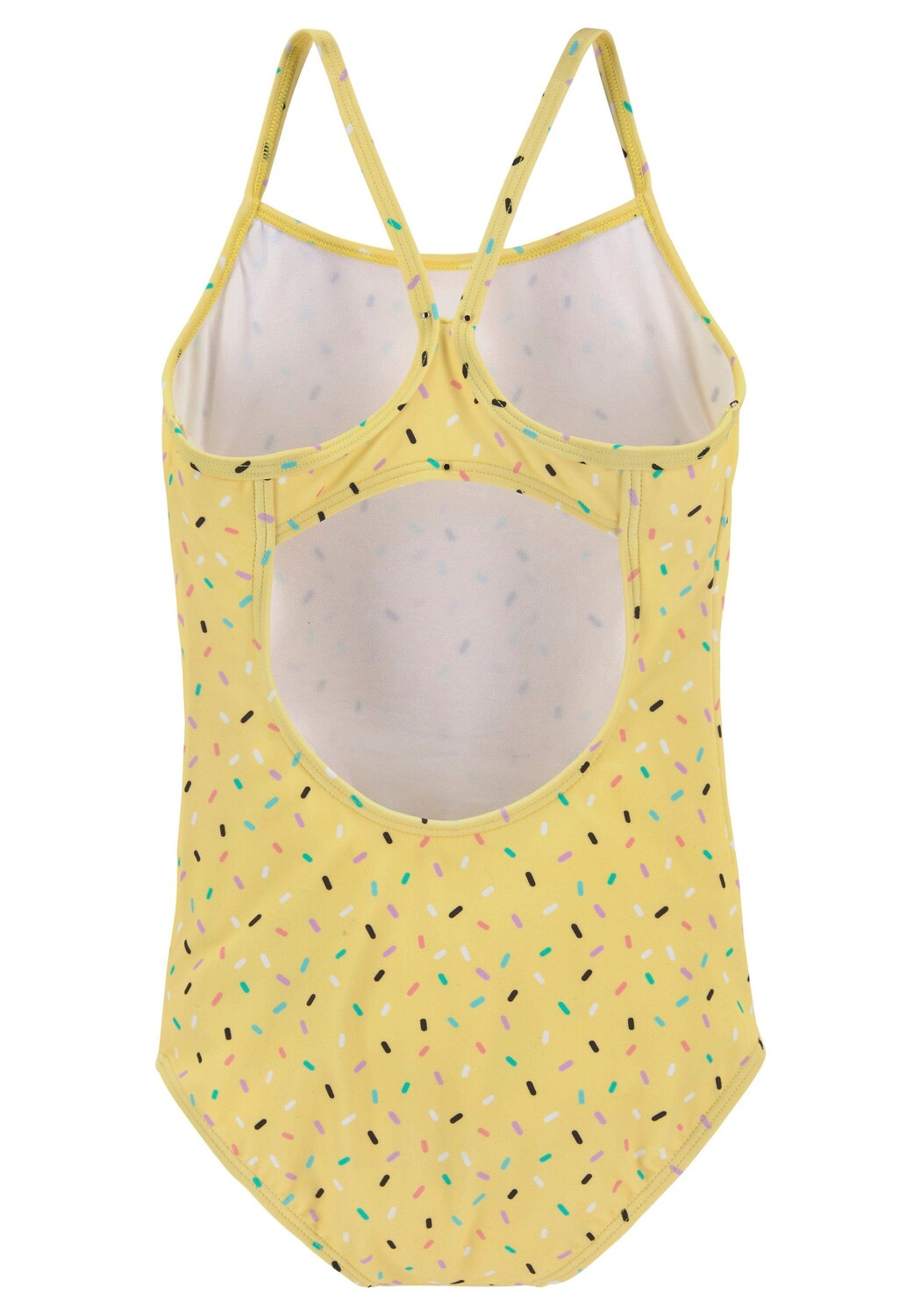 Экологичный внешний материал из переработанных материалов: 82 % полиамид, 18 % эластан. Подкладка: 100% полиэстер. Летние цвета с конфетными точками. Гоночная спина.