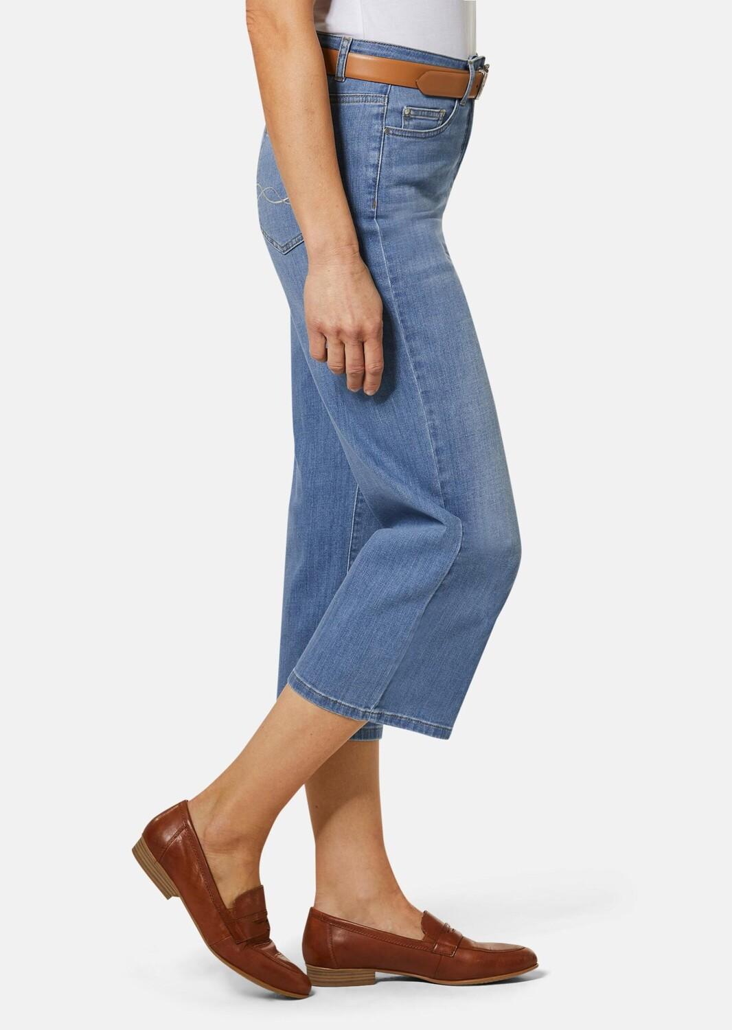 Кюлоты повседневного фасона с пятью карманами впечатляют модным прямым кроем. Джинсовая ткань с перекрестной резинкой удобна в ношении. Пояс удобной формы обеспечивает дополнительный комфорт - имеет шлевки для ремня и застегивается на молнию и пуговицу. Сумки украшены вышивкой, стразами и заклепками. Ширина по низу около 50 см. Ширина штанины прямая.