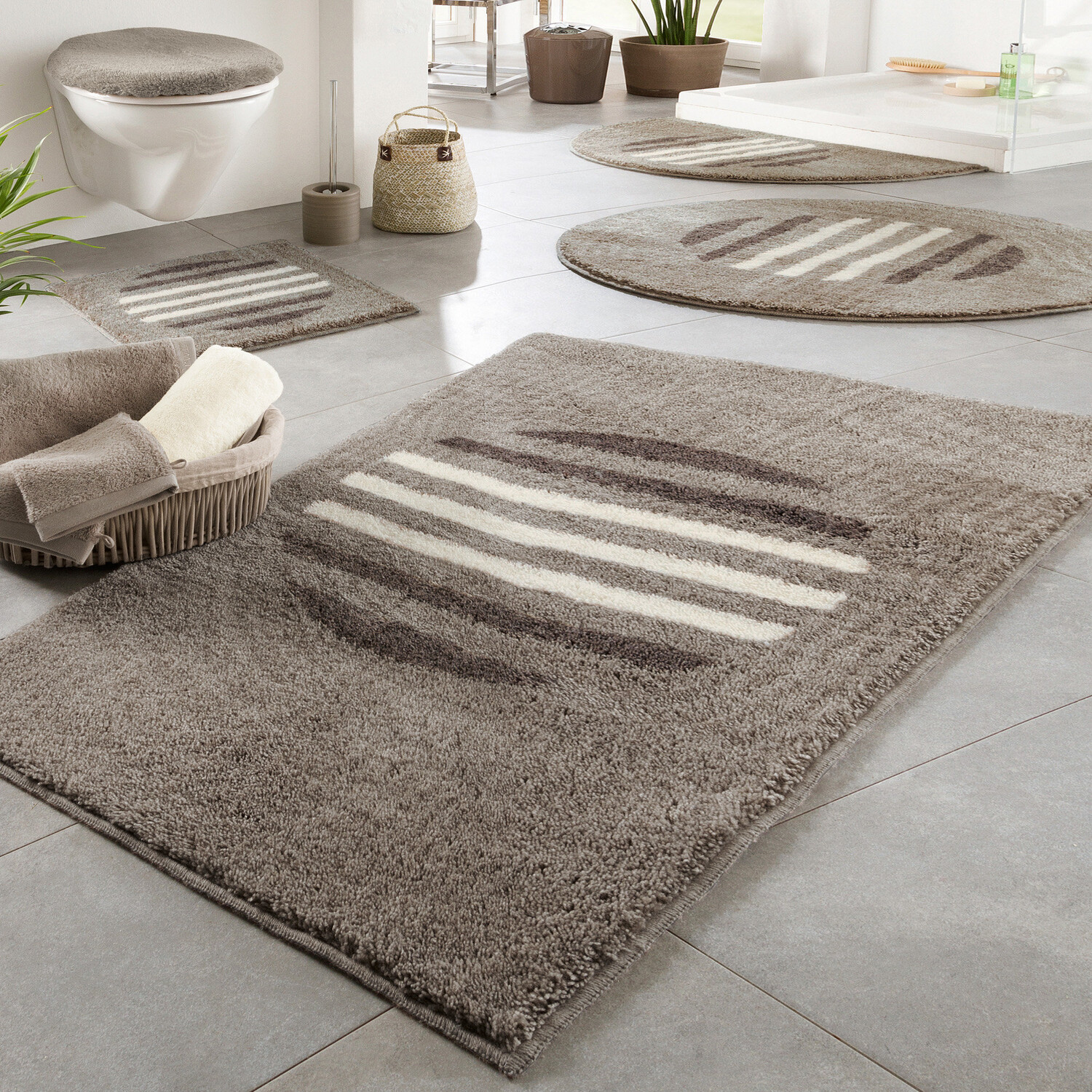 Коврик для ванной Эрвина Мюллера «Матала». Современный полосатый узор в элегантной цветовой гамме делает этот аксессуар для ванной комнаты привлекательным и привлекательным во влажной зоне. Высокий густой ворс согревает и ласкает ваши ноги. Благодаря противоскользящему покрытию на нижней стороне коврик для ванной остается на своем месте. Подходит для полов с подогревом.