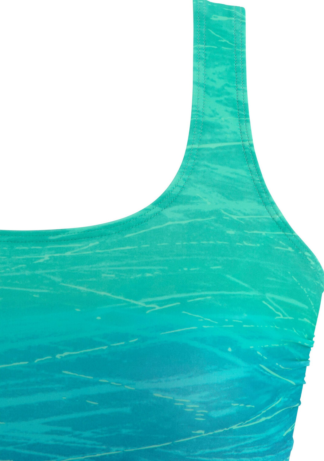 Купальник от Lascana с модным цветовым градиентом. Стильное решение по спине с перекрещенными сзади бретелями. Встроенные мягкие чашки и эластичная резинка под грудью обеспечивают хорошую фиксацию. Формирующая вставка спереди визуально стройнит силуэт. Внешний материал: 80 % полиамид, 20 % эластан. Вставка лифа: 85 % полиамид, 15 % эластан. Подкладка: 100% полиамид. Набивка: 100 % полиэстер.