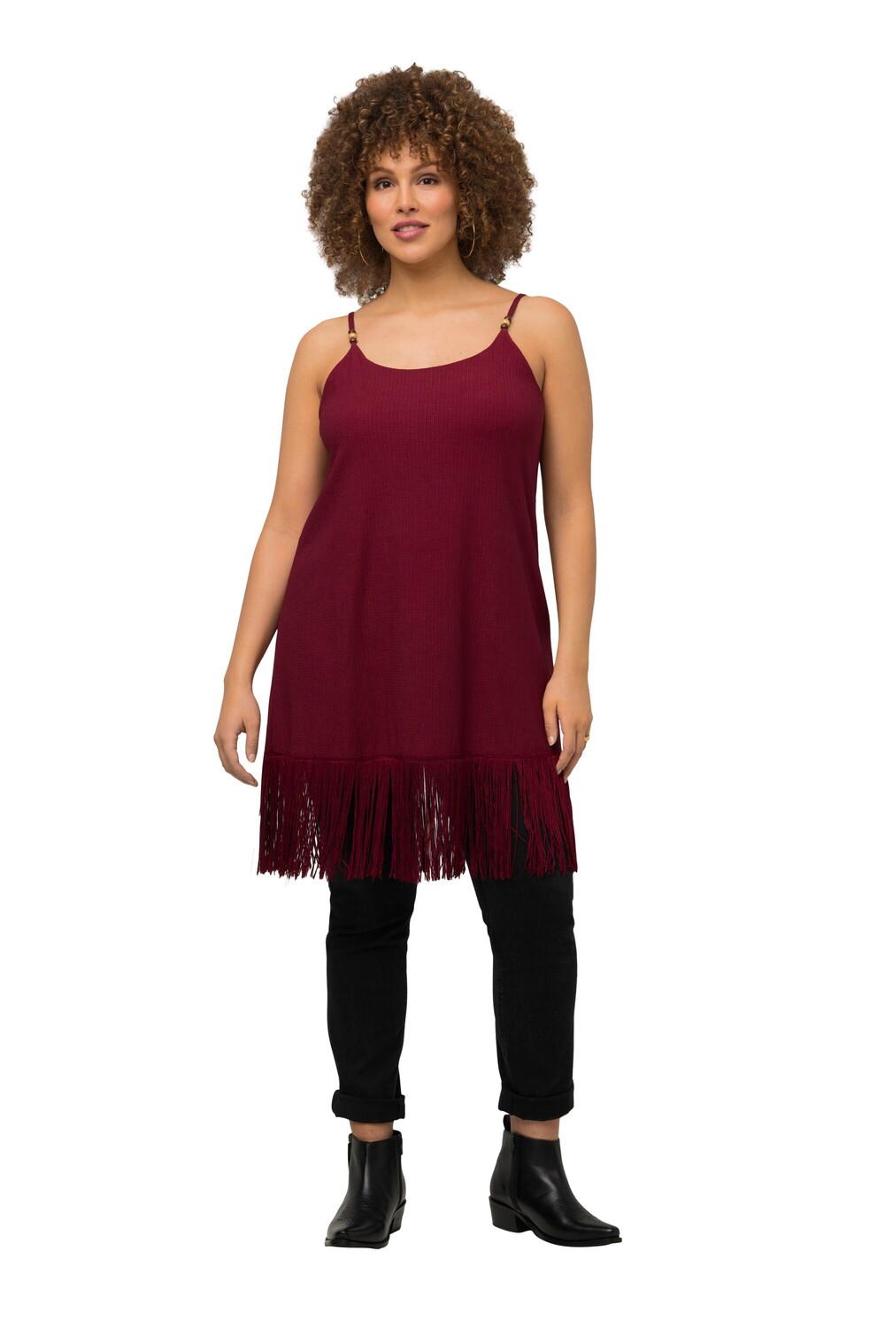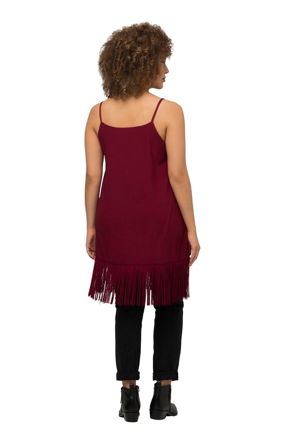 Топ А-силуэта с модной бахромой по краю. Круглый вырез, узкие бретели.