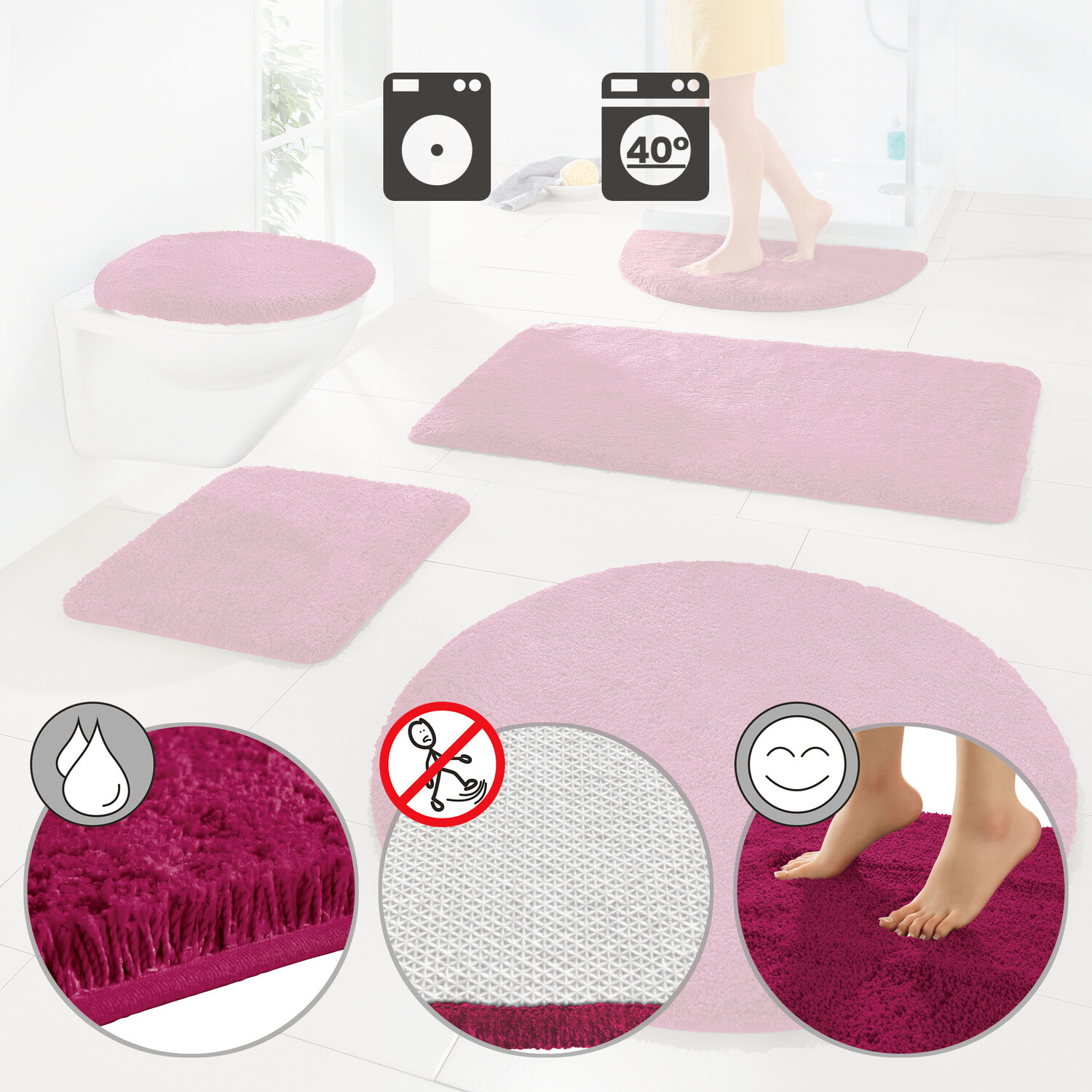 Шаблон туалета Эрвина Мюллера «Родос». С помощью этой мягкой однотонной серии вы сможете превратить свою ванную комнату в собственный оазис здоровья. Высокий густой ворс из уютной микрофибры так и манит ходить босиком. Этот материал чрезвычайно маловорсовый, ультрамягкий и впитывающий. Задняя часть с противоскользящим покрытием. С окантовкой по периметру. Подходит для полов с подогревом.