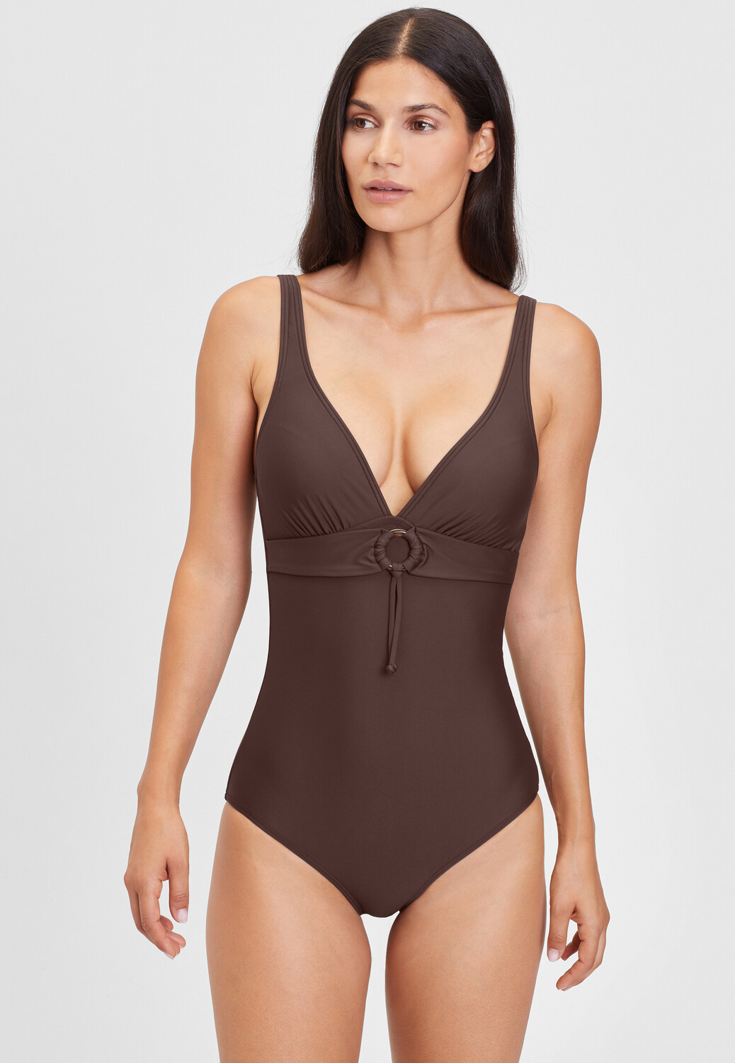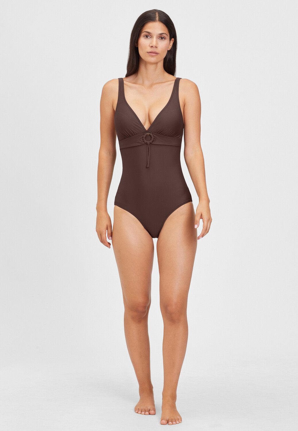 Классический купальник от s.Oliver. Глубокий V-образный вырез с тесьмой под грудью и декоративным элементом. Съемные чашки, формирующая вставка, регулируемые бретели. Низкий вырез по ноге. Очень эластичный материал.