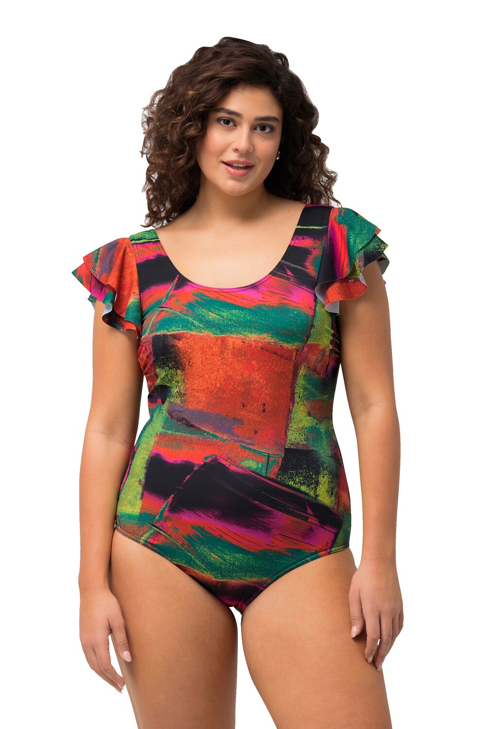 Купальник с мягкими чашками, цветным принтом по всей поверхности и оборкой с двойными рукавами. Круглый вырез, пояс под грудью, подкладка спереди.